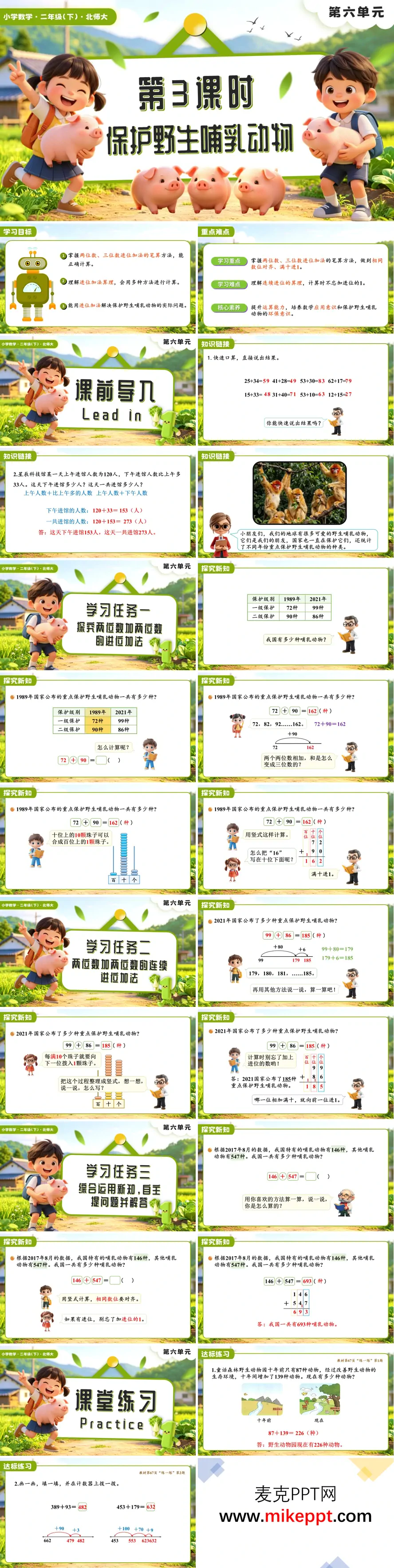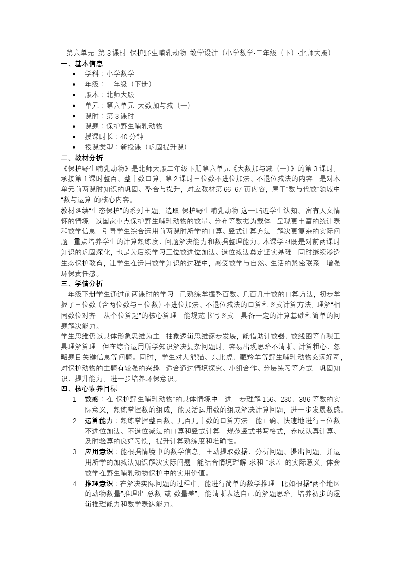 本课时为北师大版二年级下册数学第六单元《保护野生哺乳动物》第3课时,以保护野生哺乳动物为情境主线。课前通过两位数加法复习做好铺垫;课中引导学生探究两位数及三位数进位加法的笔算方法,借助计数器直观操作与拆分法算理分析,帮助学生理解"满十进一"的本质,重点突破连续进位的难点。结合动物园动物数量统计等实际问题,让学生在解决问题中掌握进位加法技巧,同步渗透保护野生动物的环保意识。巩固环节设置竖式计算等针对性练习,强化算法熟练度。课后布置思维导图绘制与分层作业,引导学生自主梳理进位加法的方法体系,提升计算能力与运用数学关注生态问题的应用意识。