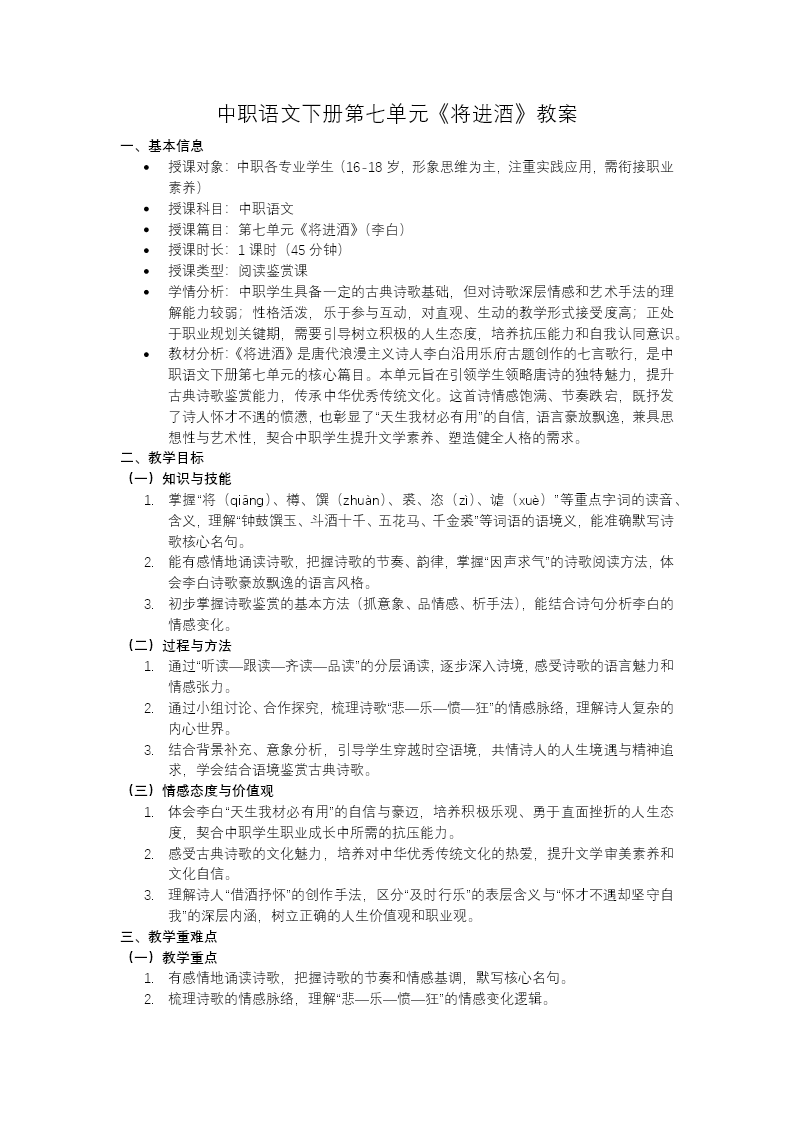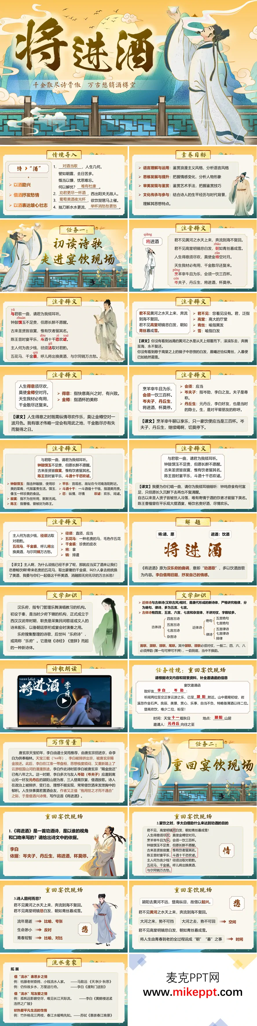 这是李白《将进酒》语文教学课件,共61页,采用国潮古风设计,内容完整覆盖浪漫主义诗歌教学要点。从情景导入与素养目标切入,先完成字音释义、解题与文学常识梳理,再以"重回宴饮现场"为情境,逐段解析诗歌情感脉络(悲→欢→愤→狂),结合黄河、白发等意象,深入分析诗人的人生感慨与浪漫主义手法。同时补充李白生平、写作背景,解析"天生我材必有用"的矛盾精神内核与诗中儒道侠思想,搭配艺术特色总结、对比阅读、当堂检测和写作作业,兼顾知识落实与文化思辨,帮助学生理解李白狂放背后的怀才不遇与豪情壮志,兼具知识性与审美性。