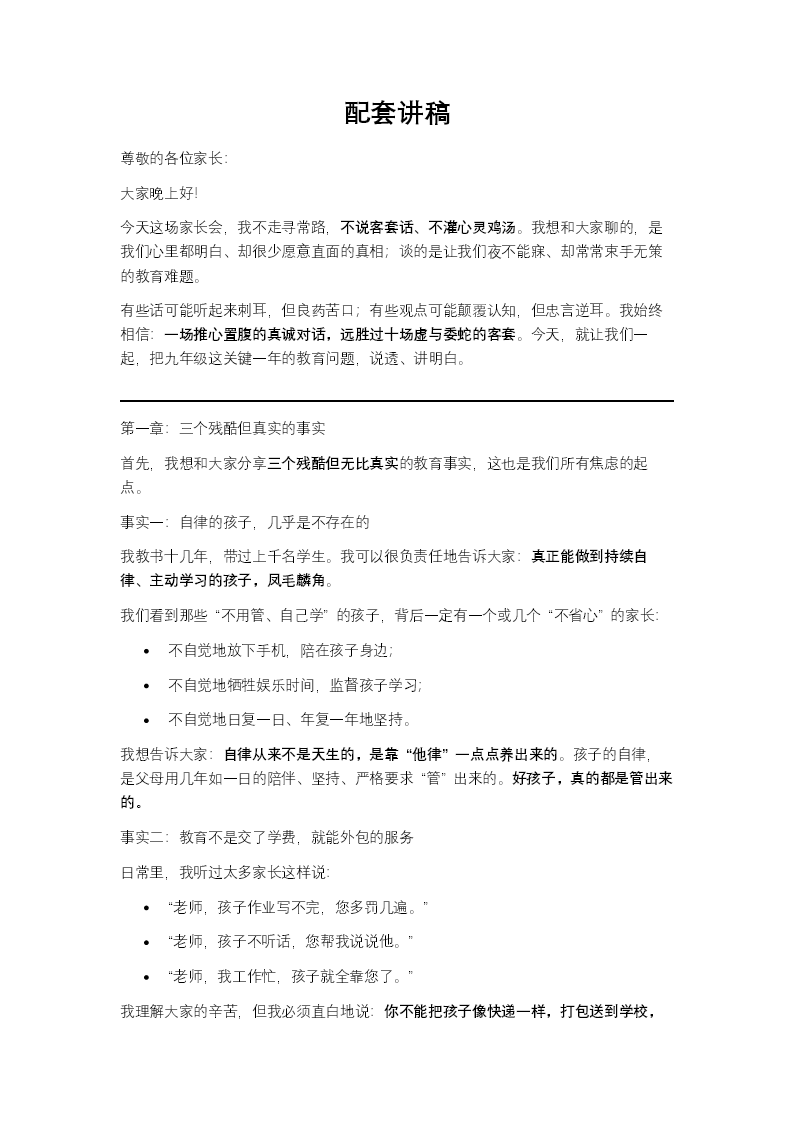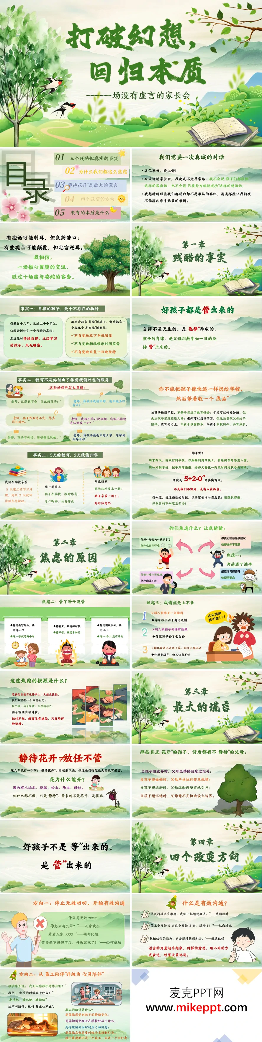 这套PPT的主题是一次坦诚的家长会,旨在打破常规,探讨家庭教育的核心真相与难题。整个PPT的内容结构清晰,情感真挚,通过揭示常见误区、分析家长焦虑并提出实际建议,力图促成家校之间的真诚对话与有效合作。内容首先从“残酷的事实”切入,明确指出了三个普遍但常被忽视的真相:第一,孩子的自律并非天生,而是源于父母长期、坚定的“他律”与陪伴;第二,教育无法完全“外包”给学校,家庭在人格塑造与习惯养成中的作用不可或缺;第三,学校5天建立的良好习惯,可能因家庭周末两天的放任而归零,即“5+2=0”的现象。接着,PPT深入剖析了家长常见的焦虑根源——如沟通无效、管教失灵、成绩停滞等——并将其归结为试图寻找教育“万能公式”的捷径心态。随后,它尖锐地批判了“静待花开”这一流行观念,指出其可能成为“放任不管”的借口,并强调真正的成长需要父母主动的灌溉与修剪。为提供解决路径,PPT提出了四个具体的改变方向:从无效的指责式沟通转向共情与鼓励的有效沟通;从“身在心不在”的物理陪伴升级为关注情绪与需求的“心灵陪伴”;从只重分数排名的“结果导向”转向关注努力与进步的“过程导向”;以及建立“三卷三松”的平衡教育观——即卷习惯、心态和品格,同时松对分数、攀比和过度控制。最后,PPT回归教育的本质,指出教育就是帮助孩子养成受益终身的好习惯,而这个过程极度依赖父母的坚持与榜样作用。在尾声部分,讲者表达了对家长压力的理解,并呼吁家校之间建立理解、配合与信任的伙伴关系,共同陪伴孩子的成长。整体而言,这套PPT语言直白有力,观点既有批判性也充满建设性,旨在激发反思并推动实际行动,核心信息是:教育没有捷径,唯有通过家校同心、坚持陪伴和以身作则,才能助力孩子健康成长。