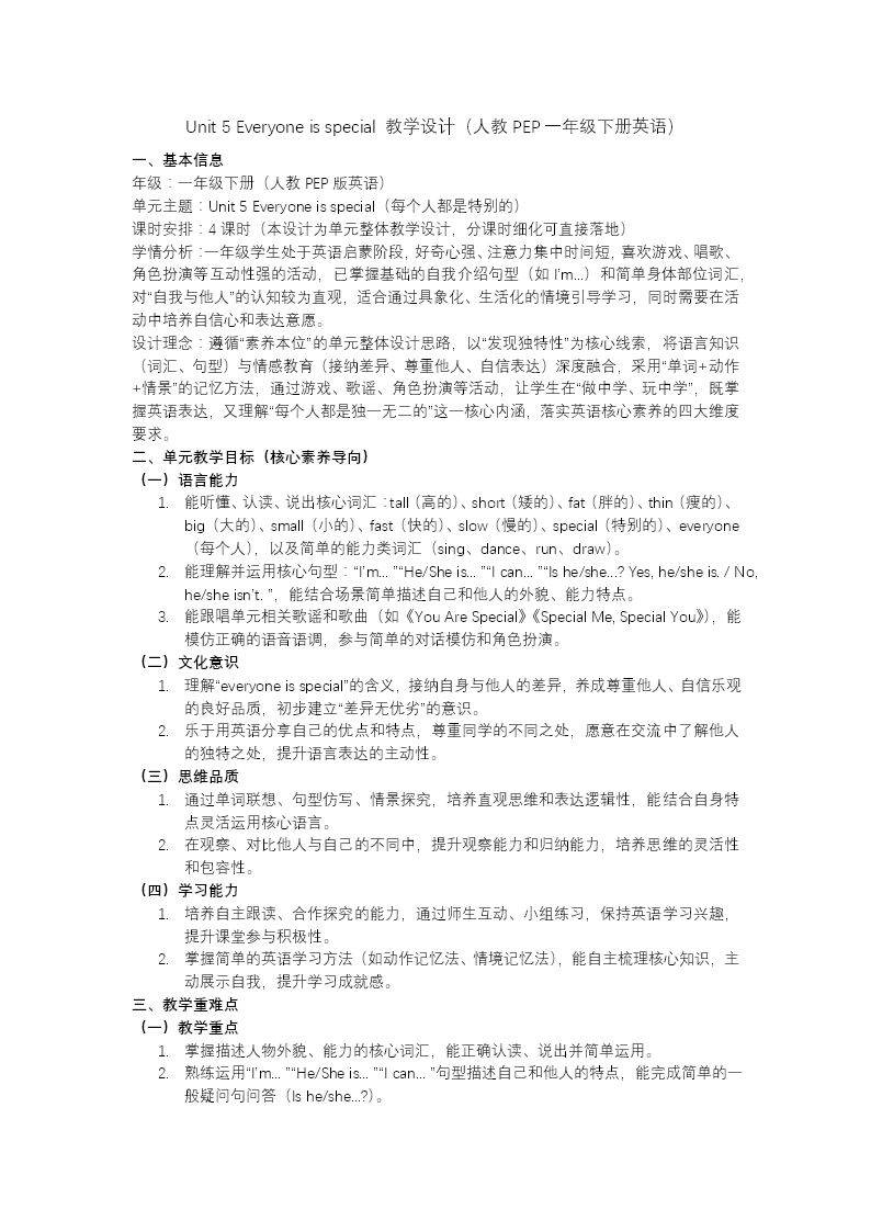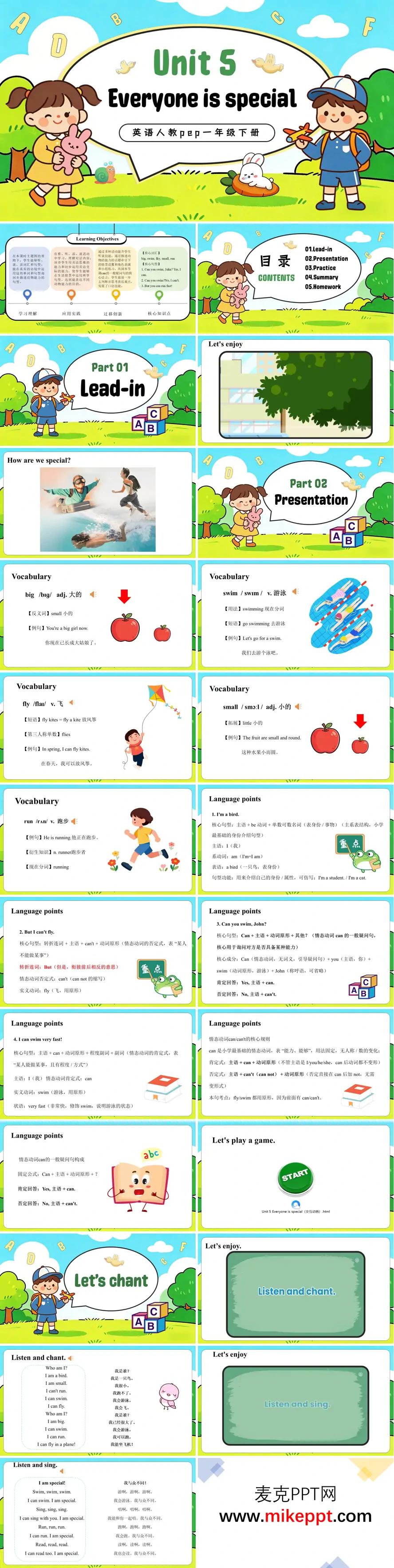 本课件为人教PEP一年级下册英语Unit 5《Everyone is special》配套教学PPT,整体采用卡通童趣风格,贴合低龄学生认知特点。全课按"导入—新知—练习—总结—作业"五环节展开:情境导入引出"认识自我与他人能力"主题;新知呈现环节聚焦big、small、run、swim、fly等核心词汇,结合"I'm a bird.""But I can't fly.""Can you swim?"等关键句型,系统梳理can的肯定、否定及疑问用法。练习环节融入chant、歌曲、看图说话、角色扮演、制作"家庭能力展示墙"等互动任务,穿插课堂游戏与趣味拓展,寓教于乐。总结环节通过填空、选择等题型巩固单词、句型及语法要点。最后布置分层作业,引导学生在真实语境中运用英语描述自己和他人的能力,体会"Everyone is special"的主题意义。