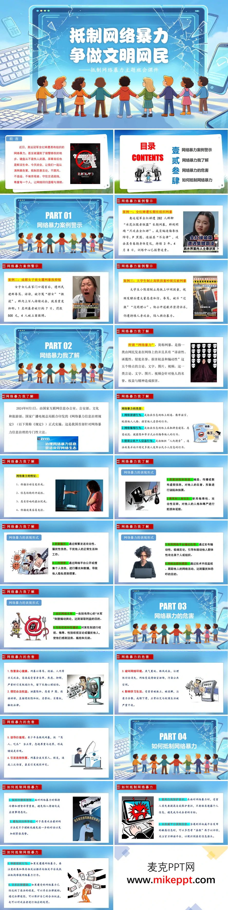 这套PPT的视觉设计紧密围绕“抵制网络暴力,争做文明网民”的主题,整体风格简洁、严肃,同时富有警示性和教育意义。PPT的封面以深色背景和清晰的白色标题点明班会主题,奠定了庄重的基调。内部大量使用了真实的新闻事件截图、社交媒体界面模拟图以及相关法律条文图片,如展示“全红婵遭网暴”事件中的群聊记录、媒体报道等,通过强烈的视觉冲击力,直观揭示了网络暴力的现实存在与严重性。在介绍网络暴力的类型、特征和表现形式时,PPT采用了分点列举的图文排版,常配有象征性的图标,如被锁链禁锢的键盘、破碎的心、蔓延的黑色箭头等,生动地诠释了“诽谤”、“侮辱”、“人肉搜索”等概念及其带来的束缚与伤害。此外,PPT在呈现网络暴力的危害和抵制方法部分,使用了对比鲜明的图片元素。一方面,展示了个体陷入抑郁、焦虑的象征性画面,以及网络空间被“戾气”污染的意象;另一方面,也配以代表“冷静思考”(如大脑图标)、“法律盾牌”、“举报按钮”和众人携手等积极图片,清晰地传递了从自我保护到寻求法律帮助的正面行动路径。结束语部分通常配以温暖、充满希望的背景图,如阳光穿透阴云、青少年携手同行等,呼应了共建清朗网络空间的号召。整体而言,这套PPT的图片内容服务于内容逻辑,从案例警示到概念解析,再到危害剖析和行动指引,通过真实案例、象征图示和对比画面,系统而有力地完成了对网络暴力的揭露、批判和对文明上网行为的倡导。