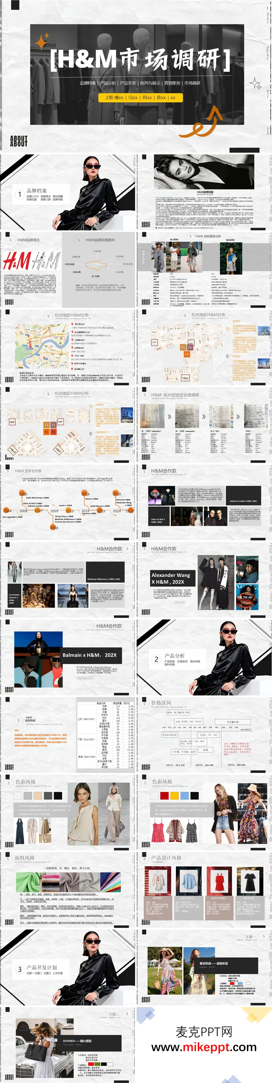 这套PPT是一份关于H&M品牌市场调研报告的演示文稿,内容系统而全面。PPT整体设计简洁现代,以红、白、黑为主色调,符合H&M的品牌视觉形象。文档内容通过清晰的章节划分,逻辑清晰地展示了调研的各个方面。PPT的内容结构主要分为六个核心部分:1.品牌档案:介绍了H&M的品牌历史、全球业务、品牌理念(专注、警惕、尊重员工)、目标客群(以24-35岁的年轻职业女性为核心)以及在杭州地区的门店分布(如利星名品店、西湖银泰店等)和选址策略(专注于黄金商圈)。2.产品分析:通过数据图表详细分析了H&M的产品构成、价格区间、色彩与面料风格。例如,用表格展示了各类别产品(如连衣裙、套衫)的占比,用价格波段图说明了主力产品集中在39.9至499元的实惠区间,并通过图片对比了LADIES系列的优雅色系和DIVIDED系列的青春亮色。3.产品开发计划:提出了三个具体的产品主题,包括“春日风尚--波西米亚”、“DIVIDED-随心搭配”和“大卫·贝克汉姆精选”,并分别展示了主打款式、色彩板和风格理念的视觉化页面。4.陈列与展示:图文并茂地阐述了H&M店铺的整体形象、统一的橱窗风格、依据“红线原则”的重点区域(如入口A区、试衣间外)陈列,以及具体的叠装、侧挂、正挂和模特出样等细节规范。5.营销策划:系统分析了H&M的四大营销策略,包括与顶级设计师的跨界合作(产品策略)、全媒体广告宣传、在线销售渠道的拓展以及季中折扣、节日促销等灵活的促销策略。6.市场调研总结:基于问卷调查数据,以信息图形式分析了消费者选择H&M的主要理由(如价格合理、地段便利)、平均购物时间,并指出了品牌存在的劣势(如质量口碑、市场竞争激烈),最后提出了相应的发展建议。整体而言,这份PPT通过大量图表、数据、图片和简洁的文字说明,从多个维度对H&M品牌进行了深入剖析,视觉化程度高,信息点明确,是一份结构完整、论据充实的商业分析报告。