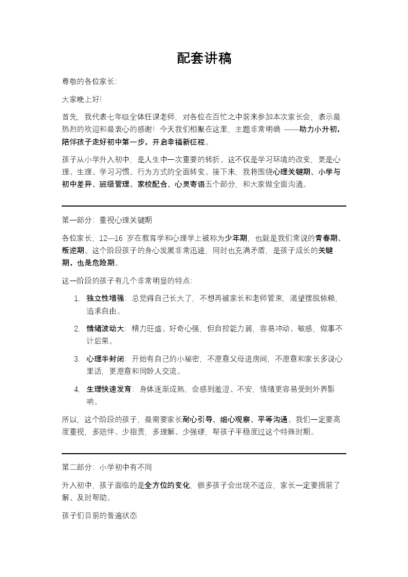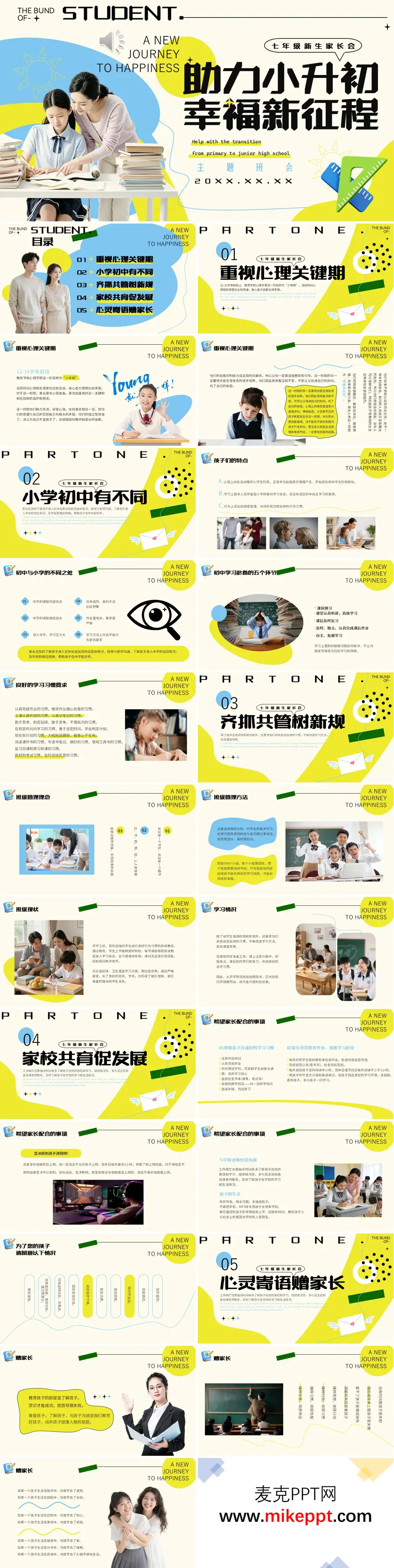 这套PPT是为七年级新生家长会设计的,主题为“助力小升初幸福新征程”,旨在帮助家长了解孩子从小学过渡到初中这一关键时期,并指导家校如何协同支持孩子的发展。PPT的整体设计风格现代简洁,以蓝色为主色调,配以清晰的图标和图文排版。内容上,PPT分为五个主要部分。第一部分强调了“重视心理关键期”,指出12-16岁是“少年期”或“青春叛逆期”,身心变化迅速,矛盾增多,独立意识增强但自制力较低,家长需加强监护和引导。第二部分对比“小学初中有不同”,详细列举了初中在课程内容、难度、压力、竞争、作业量和学习方法上的显著变化,并提出了初中学习必备的五个环节(预习、听课、复习、作业、拓展)以及一系列具体的学习习惯要求。第三部分关于“齐抓共管树新规”,介绍了班级采用积分制进行管理,追求卓越班风学风,并提到开学初期学生在纪律、行为习惯方面已取得良好开端。第四部分“家校共育促发展”是重点,向家长提出了多项希望配合的具体事项,包括帮助孩子养成良好学习习惯、检查作业、监督阅读和上网、控制零花钱、关注孩子社交,并特别列举了需要留意的异常情况(如在外留宿、成绩骤降等)。第五部分“心灵寄语赠家长”则以富有哲理的语言,强调了解、尊重、赏识孩子的重要性,指出不同的家庭环境对孩子性格的塑造作用,并以鼓励和信任的寄语作为结束。整体而言,这套PPT内容系统全面,从心理认知、学习指导、班级管理和家校合作多个维度,为新生家长提供了清晰的指引和实用的建议。