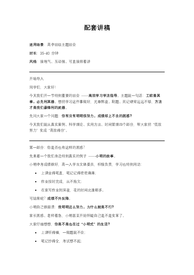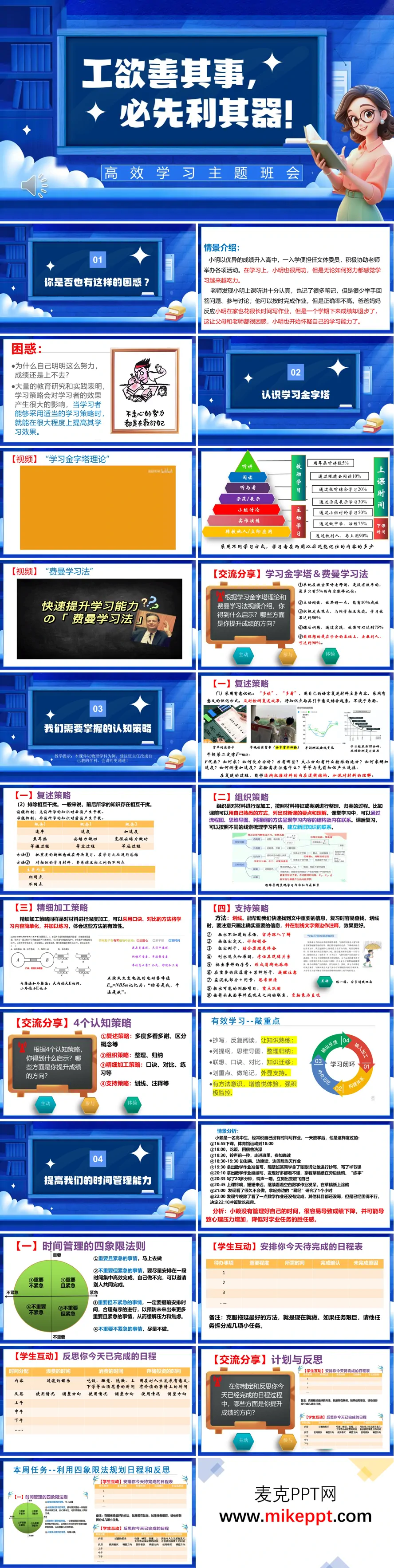这套PPT以“高效学习”为主题,是一份结构清晰、内容实用的班会或学习指导材料。其核心目的是引导学生认识学习方法的重要性,并掌握具体、可操作的学习策略与时间管理技巧。PPT开篇通过“小明”的案例,揭示了“努力但成绩不佳”的普遍困惑,从而引出一个核心观点:学习策略是影响学习效果的关键因素。这为后续内容奠定了基调。紧接着,PPT引入了“学习金字塔”理论和“费曼学习法”(通过视频形式),强调了主动学习与输出的极高价值。它明确指出,从被动听讲(留存率约5%)到主动教别人(留存率可达90%),学习效率有天壤之别,启示学生必须转变学习方式,积极参与和体验。文档的核心部分系统介绍了四大认知策略,并以物理学科为例进行了生动阐释:1.复述策略:强调有意识记、用自己的话复述,并注意排除新旧知识间的“前摄抑制”与“后摄抑制”干扰,通过对比表格区分易混概念。2.组织策略:推荐使用流程图、思维导图、列提纲等方法对知识进行深加工和归类,建立知识体系。3.精细加工策略:提倡用口诀、对比、联想等方法深化理解,并给出了“内接法外接法”、“正弦式交变电流公式”等具体记忆口诀示例。4.支持策略:重点讲解了“划线”与做注释的技巧,列出了九种具体的划线标注目标(如标定义、例子、逻辑关系等),将阅读转化为主动思考的过程。最后,PPT通过“小赖”的时间管理反面案例,引入了时间管理“四象限法则”,指导学生按“重要-紧急”维度对任务分类优先级。它还提供了“待办日程表”和“时间反思表”两个实用工具模板,鼓励学生立即规划、反思时间分配,将“浪费的时间”转化为“投资的时间”,并强调克服拖延的方法是“现在就做”和任务分解。整体而言,这套PPT的内容从“道”(学习理念)到“术”(具体策略与工具)层层递进,旨在帮助学生实现从“埋头苦学”到“抬头巧学”的转变,最终提升学习效率与成绩。其设计互动性强,留有大量让学生交流分享、制定计划与反思的环节。