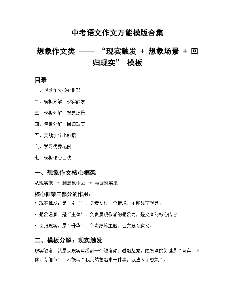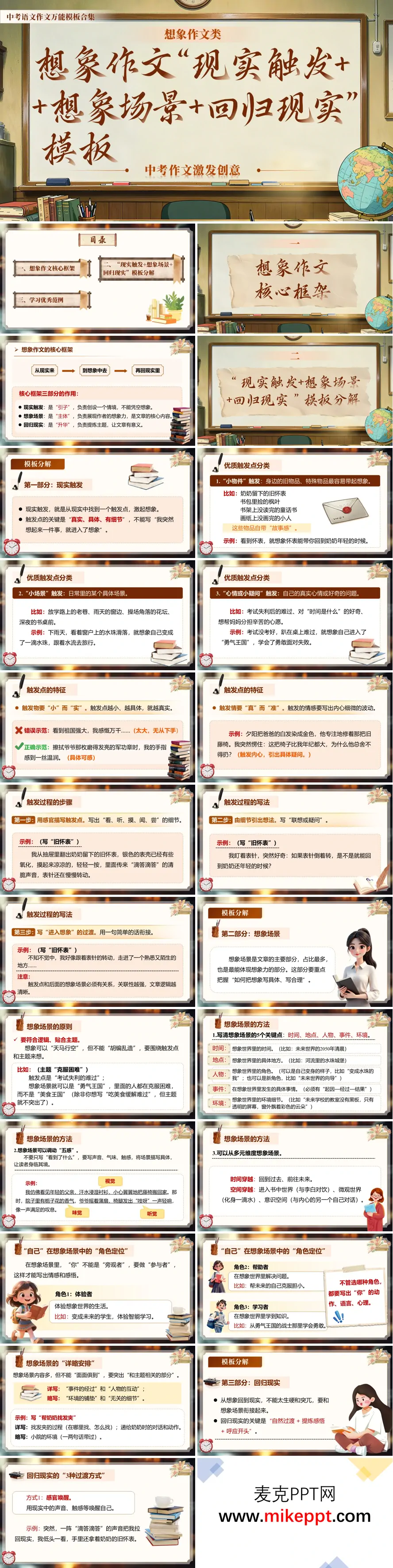 这套 PPT 是中考想象作文高分模板,共 41 页,以"现实触发 + 想象场景 + 回归现实"为核心框架,助你写出创意十足且紧扣主题的考场作文。内容先拆解模板逻辑:以现实中的小物件、场景或心情为"触发点",引出合理想象;中间部分从时间、地点、人物等维度构建想象世界,运用五感描写让内容具体可感;结尾借助感官唤醒、物品关联等方式自然回归现实,实现主题升华。同时,PPT 配套优秀范文片段、加分技巧与核心口诀,帮助你规避想象空洞、逻辑脱节等常见问题,写出立意"小而真"、细节饱满的高分想象作文。