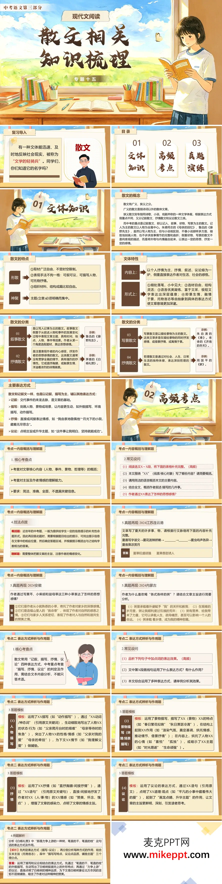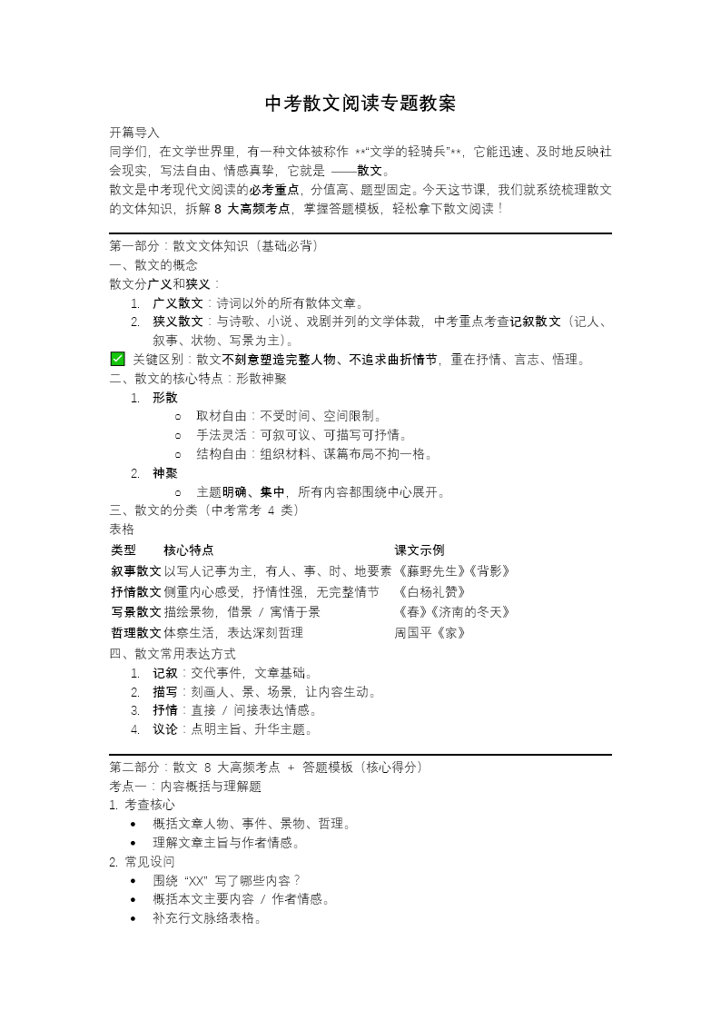 这是一份中考语文散文阅读专题梳理资料,系统覆盖备考所需的三大核心板块。第一板块:文体知识奠基从散文的本质概念出发,厘清其"形散神聚"的核心特点,梳理叙事、抒情、议论等常见分类,并详解记叙、描写、抒情、议论、说明五种表达方式的运用规律,帮助学生搭建完整的文体认知框架。第二板块:高频考点突破聚焦中考散文阅读的八大核心考点:内容概括与理解、表达方式作用分析、语言特色赏析、人物形象解读、句子含义探究、标题与段落作用、写作手法辨析及拓展探究。每个考点均配典型真题示例,并提炼可操作的答题模板,拆解审题思路与得分要点,实现从"懂题"到"会答"的跨越。第三板块:真题实战巩固精选近年中考真题,附完整解析与评分标准,让学生在真实考境中检验所学、熟悉命题逻辑,提升应试熟练度与答题规范性。