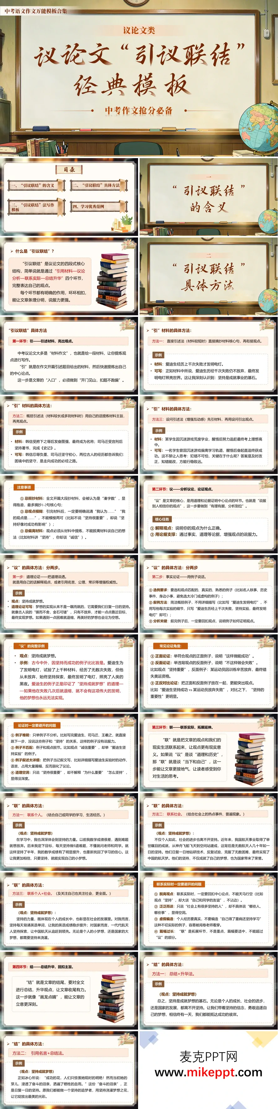 这套 PPT 是中考议论文高分模板,共 40 页,以"引—议—联—结"为核心结构,帮助初中生快速掌握材料议论文写作。开篇"引"指导如何精准引述材料、提炼中心论点;中间"议"讲解运用道理与事实论据,从正反角度展开论证;随后"联"教你联系个人经历或社会现实,增强文章现实意义;结尾"结"则传授总结升华、回扣主旨的收束方法。同时,PPT 配套各环节具体方法、避坑指南、实战技巧及完整范文示例,帮助考生规避观点模糊、论据脱节、脱离实际等问题,写出逻辑严谨、论证有力的高分议论文。