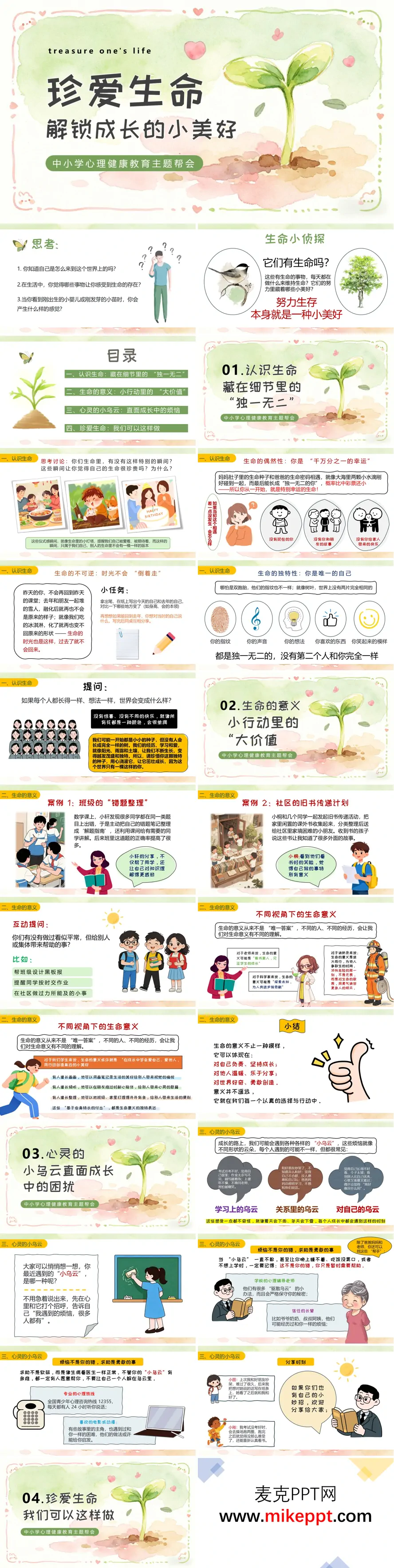 这套心理健康教育主题班会PPT以清新水彩风格呈现,主题为"珍爱生命,解锁成长的小美好",面向中小学生设计。内容分为四个板块:感知生命:通过启发性提问和"生命小侦探"互动环节,引导学生认识生命的存在,理解生命诞生的偶然性、发展的不可逆以及每个个体的独特性。探索价值:借助错题整理、旧书传递等贴近学生生活的案例,阐释生命价值的多元性,帮助学生发现平凡日常中的意义。直面困扰:梳理学习压力、人际交往、自我认知等成长阶段常见烦恼,提供切实可行的求助渠道与应对策略,鼓励学生主动寻求支持。践行关爱:从饮食均衡、规律作息、适度运动、情绪调节等方面给出具体建议,配合互动任务与"生命成长卡",引导学生将关爱生命落实到日常行动中。整套课件旨在帮助学生建立对生命的认知与尊重,学会接纳自我、关怀自己,在成长过程中发现并珍藏那些微小而确定的美好。