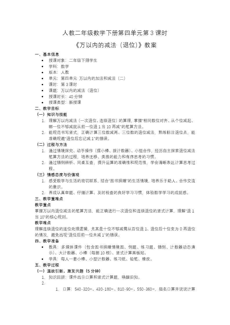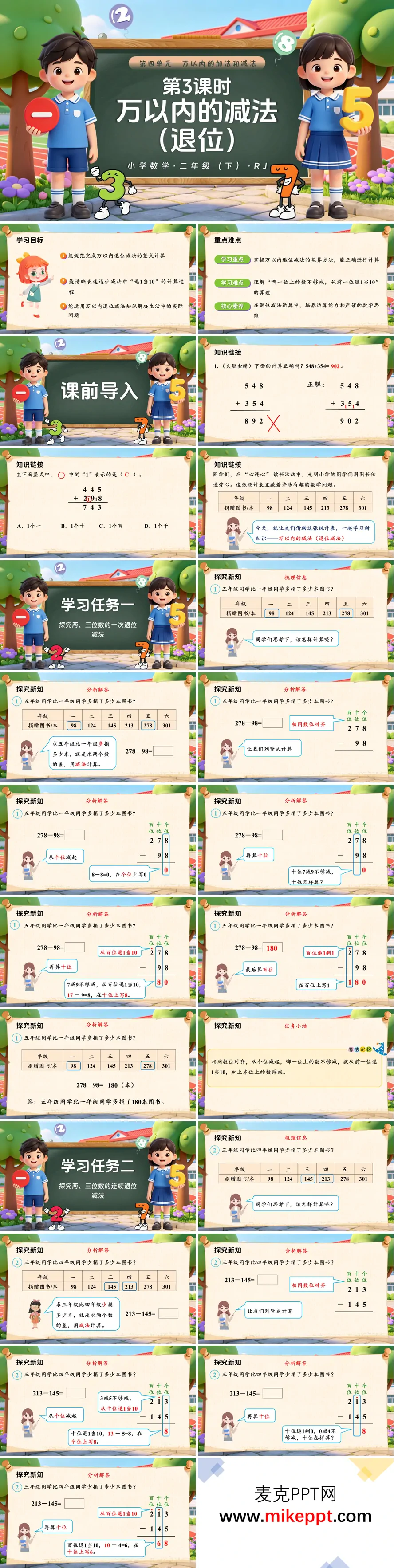 这份PPT是人教二年级下册数学第四单元教学课件,共 32 页,围绕万以内退位减法展开教学。先通过加法错题回顾和进位知识检测唤醒旧知,再以"心连心"读书活动捐赠图书统计表为情境,引出减法问题,逐步探究退位减法的计算方法。核心学习任务分为两部分:一是一次退位减法,以 278−98 为例,讲解竖式计算"相同数位对齐、从个位减起"的规则,重点演示十位不够减时从百位退 1 当 10 的计算过程,帮助学生理解"退 1 当 10"的算理;二是连续退位减法,以 213−145 为例,延伸到个位、十位连续不够减的情况,演示从十位退 1、再从百位退 1 的连续退位步骤,强化退位逻辑。最后通过课堂练习和生活实际问题巩固计算技能,总结退位减法核心要点:从个位减起,哪一位不够减就从前一位退 1 当 10,并提醒标记退位点避免遗忘。课后布置思维导图与分层作业,帮助学生梳理知识、提升运算能力。