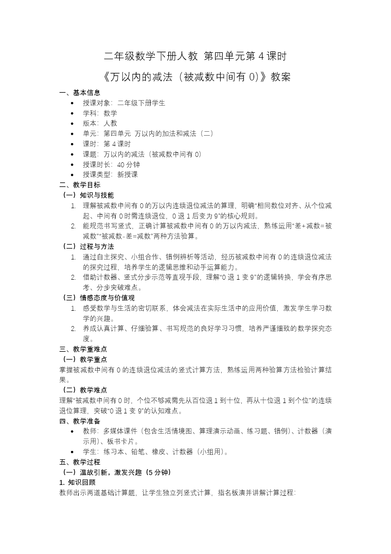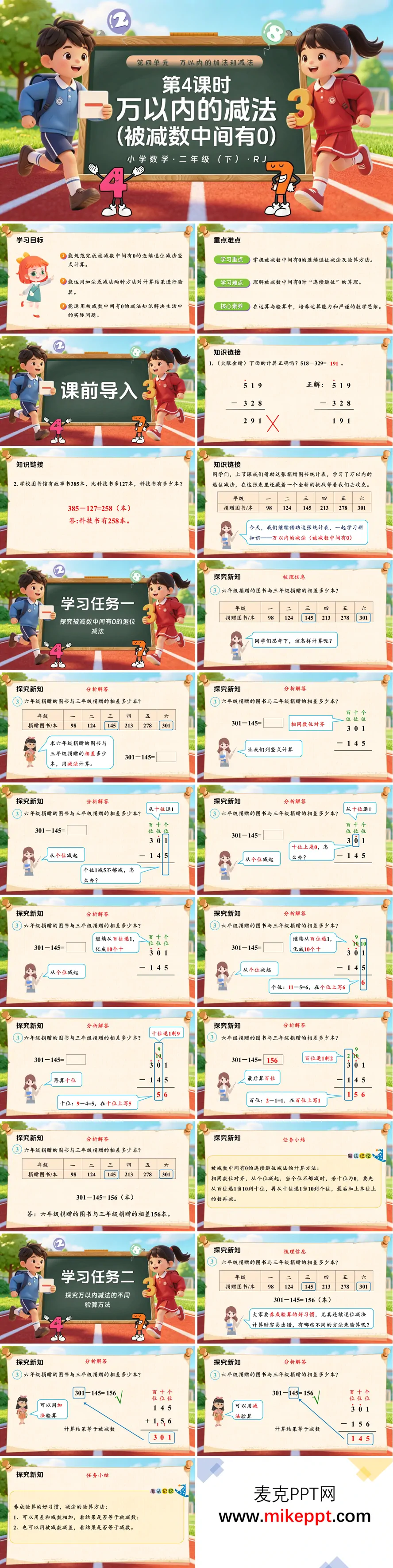 这份 PPT 是人教二年级下册数学第四单元教学课件,共 30 页,聚焦被减数中间有 0 的连续退位减法。先通过退位减法错题回顾和旧知应用题唤醒已有经验,再以"心连心"读书活动捐赠图书统计表为情境,引出核心问题"301−145",逐步引导学生探究被减数中间为 0 时的退位算理。核心学习任务分为两部分:一是被减数中间有 0 的退位减法,以 301−145 为例,演示个位 1 减 5 不够减时,因十位为 0,需先从百位退 1 当 10 到十位,再从十位退 1 当 10 到个位的连续退位过程,帮助学生理解"0 上有点看作 9"的计算技巧;二是减法的验算方法,介绍"差 + 减数"是否等于被减数、"被减数−差"是否等于减数两种验算方式,培养验算习惯,确保计算准确。最后通过课堂练习和生活实际问题巩固计算与验算技能,总结核心要点:被减数中间为 0 时需连续退位,标记退位点避免遗忘,计算后要及时验算。课后布置思维导图与分层作业,帮助学生梳理知识、提升运算严谨性。