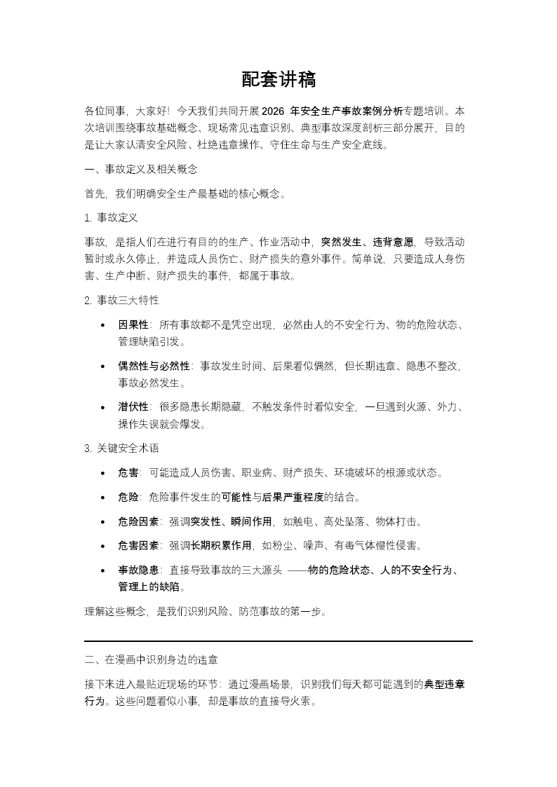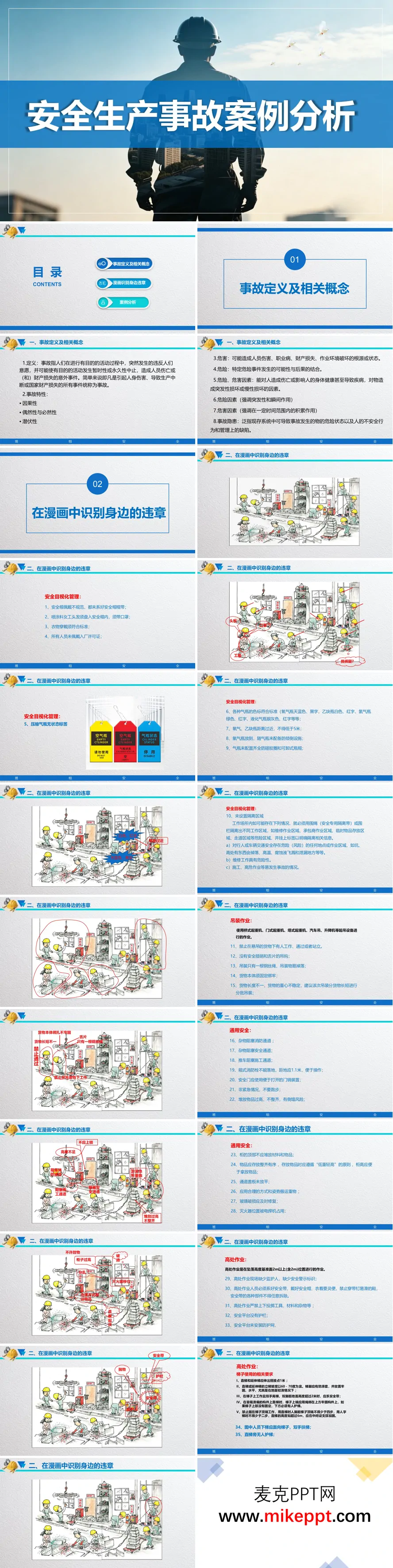 这套PPT是一份系统的企业安全生产培训材料,其核心目标是提升员工的安全意识与风险识别能力。内容主体可分为三个循序渐进的部分:首先,文档开篇明确了事故、危险、隐患等基础概念,从理论上阐述了事故的特性(如因果性、潜伏性)及其可能造成的危害,为后续学习建立了知识框架。其次,文档的核心部分通过“在漫画中识别身边的违章”这一生动形式,系统梳理了作业现场常见的安全隐患。它涵盖了安全目视化管理(如安全帽佩戴、气瓶标签与存放)、吊装作业、通用安全(如消防通道畅通)、高处作业(安全带使用、梯子规范)、动火作业(监护、防护)以及临时用电(一机一闸、线路保护)等多个关键领域,逐一列出了具体的违规情形,如气瓶间距不足、吊物下站人、配电箱前堆放杂物等,极具指导性和可操作性。最后,文档通过“昆山工厂粉尘爆炸”和“佛山工厂稀释剂爆燃”两个重大真实案例进行深入分析。不仅还原了事故经过,更重点剖析了爆炸原因(如粉尘浓度超标、易燃液体挥发遇明火),并详细讲解了此类事故的发生条件、破坏特点、防范措施以及应急救援方法。文档结尾还附上了《严防企业粉尘爆炸五条规定》等法规,强调了制度管理的重要性。总而言之,这套PPT从理论到实践,再从案例回溯教训,构成了一套完整的企业安全生产培训体系,旨在让学习者深刻理解安全规范背后的原理,并具备识别和防范身边风险的能力。