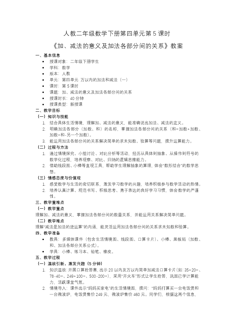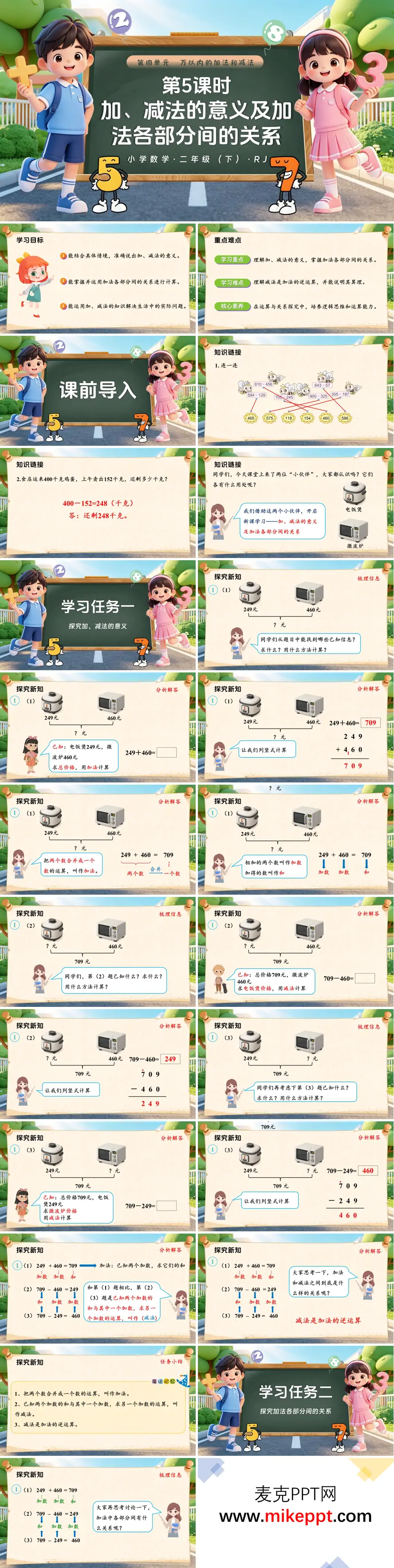 这份PPT是人教二年级下册数学第四单元教学课件,共 32 页,聚焦加减法的意义与加法各部分间的关系。先通过旧知计算和应用题唤醒已有经验,再以电饭煲、微波炉的价格为情境,引出三组递进问题,逐步探究加减法的本质:一是探究加减法的意义,已知两个单价求总价,引出加法——把两个数合并成一个数的运算,明确"加数 + 加数 = 和";已知总价和一个单价求另一个单价,引出减法——已知和与一个加数,求另一个加数的运算,点明"减法是加法的逆运算"。二是探究加法各部分间的关系,从算式 249+460=709 及逆运算中,总结出核心关系:和 = 加数 + 加数,加数 = 和 − 另一个加数。最后通过课堂练习巩固关系应用,让学生能根据加法算式直接说出对应减法结果。课后布置思维导图与分层作业,帮助梳理知识、培养运算与逻辑思维能力。