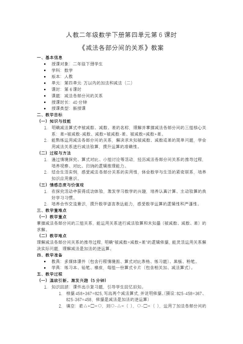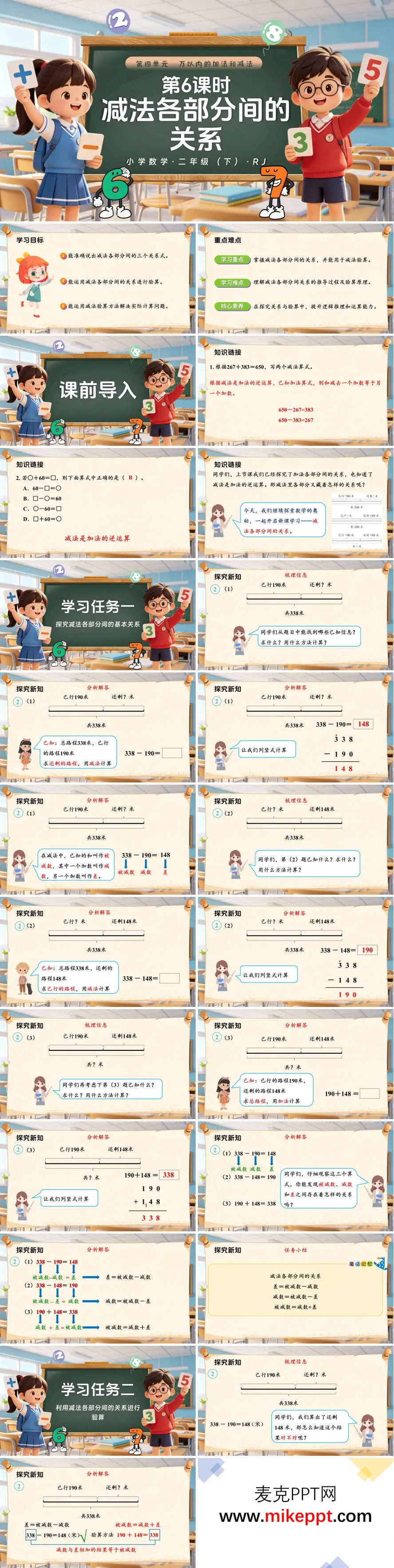 这份PPT是人教二年级下册数学第四单元教学课件,共 31 页,聚焦减法各部分间的关系及验算方法。先通过加法逆运算和旧知练习唤醒已有经验,回顾"减法是加法的逆运算",再以"总路程 338 米,已行 190 米"为情境,引出三组递进问题,逐步探究减法各部分关系:一是探究基本关系,已知总路程和已行路程求剩余路程,338−190=148,明确被减数−减数=差;已知总路程和剩余路程求已行路程,338−148=190,得出被减数−差=减数;已知已行和剩余路程求总路程,190+148=338,总结减数+差=被减数。二是学习减法验算,利用"减数+差=被减数"的关系验证计算结果,如用 190+148=338 检验 338−190=148 的正确性,培养验算习惯。最后通过课堂练习巩固关系应用与验算方法,总结核心关系式。课后布置思维导图与分层作业,帮助学生梳理知识、提升运算与逻辑推理能力。