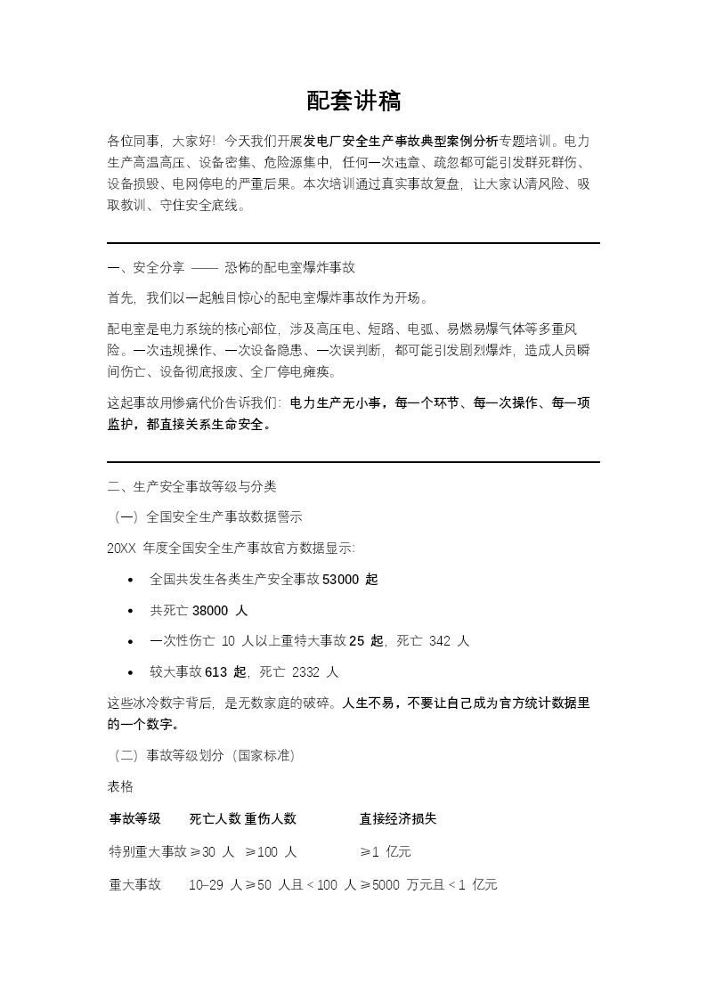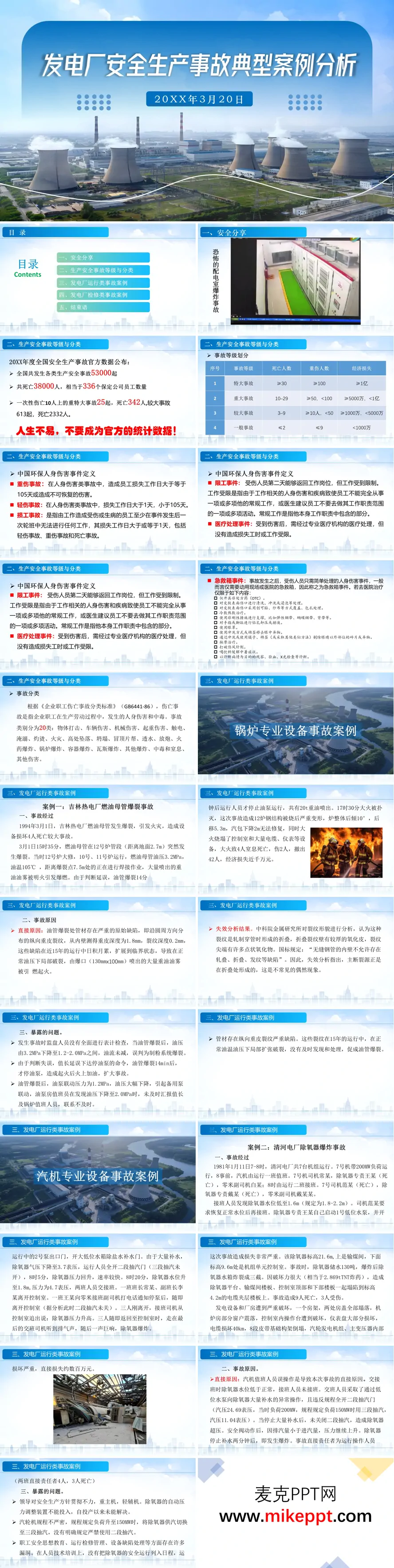 这份PPT文档的标题是“发电厂安全生产事故典型案例分析”,其核心内容是对发电厂相关的生产安全事故进行系统性的介绍与分析,旨在通过实际案例进行安全教育。文档内容主要分为五个部分:1.安全分享:以“恐怖的配电室爆炸事故”为例,点明主题,强调安全的重要性。2.生产安全事故等级与分类:详细介绍了中国对生产安全事故的等级划分(特大、重大、较大、一般事故)及其量化标准(死亡、重伤人数和经济损失)。同时,详细阐述了中国环保体系对人身伤害事件的定义,如损工事故、限工事件、医疗处理事件、急救箱事件等。最后,列出了国家标准中事故的20个分类,如物体打击、触电、高处坠落等。3.发电厂运行类事故案例:此部分为核心,通过三个具体的运行事故案例进行深入剖析: ◦ 案例一(吉林热电厂):燃油母管因原始缺陷爆裂引发火灾,造成4人死亡的较大事故,暴露了设备缺陷管理、运行人员误判和应急处理延误等问题。 ◦ 案例二(清河电厂):除氧器因运行人员误操作导致超压爆炸,造成9人死亡的重大事故,暴露了规程不严密、设备管理缺陷和安全教育不足等问题。 ◦ 案例三(新乡电厂):因锅炉灭火、处理不当导致汽轮机进水,进而引发汽轮发电机组轴系断裂的灾难性设备事故,详细描述了事故经过和惊人的设备损坏情况,分析了操作不当是事故诱因,水冲击是直接起因。4.发电厂检修类事故案例:此部分通过四个检修相关的事故案例,展示了不同作业风险: ◦ 案例四(电气误操作):工作人员误入带电间隔导致触电重伤及全厂停电,暴露了工作票执行、监护制度方面的严重漏洞。 ◦ 案例五(有限空间中毒):人员进入有限空间作业发生一氧化碳中毒,因盲目施救导致伤亡扩大,暴露了安全防护缺失、培训不到位和安全管理混乱的问题。 ◦ 案例六(高处坠落):检修作业中省煤器坍塌导致2死2伤的高处坠落事故,主要原因是承包商管理缺失、交叉作业协调不力、安全措施(如安全带)未落实。 ◦ 案例七(机械伤害):员工在皮带输送机旁作业时,因防护装置缺失、环境不良导致手臂被卷入身亡,暴露了设备防护、现场环境、安全培训和应急救护等多方面问题。5.结束语:总结强调事故的必然性源于细节疏忽,呼吁重视现场管理、隐患排查,并将“四不伤害”原则转化为日常行为准则,最终以“生命是1,其他是0”的比喻强调了生命安全的核心地位。整份文档结构清晰,从理论定义到具体案例,从运行到检修,全面分析了发电厂安全生产的各类风险、事故原因和暴露的问题,是一份用于安全生产教育和经验反馈的典型材料。由于您未提供文档中的实际图片,以上描述完全基于您提供的文本内容。