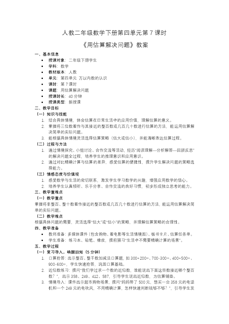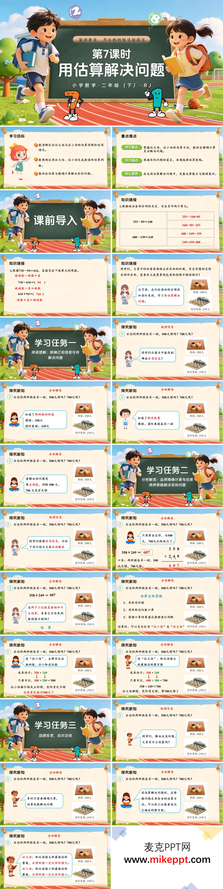 这份PPT是人教二年级下册数学第四单元教学课件,共 30 页,聚焦估算策略在实际问题中的应用。先通过减法各部分关系的旧知练习唤醒已有经验,再以"购买围棋(358 元)和国际象棋(249 元)"的生活情境,引出核心问题:判断 500 元、700 元是否足够支付,逐步引导学生探究估算方法。核心学习任务分为三部分:一是阅读理解,梳理已知信息与待解决问题,明确需要判断总价与金额的大小关系;二是分析解答,先通过精确计算得出总价为 607 元,再引入估算思路——往小估,将 358 估为 300、249 估为 200,300+200=500,实际总价超过 500,判断 500 元不够;往大估,将 358 估为 400、249 估为 300,400+300=700,实际总价小于 700,判断 700 元足够;三是回顾反思,总结估算适用场景为只需大致判断时,区分"往大估""往小估"的逻辑,同时明确精确计算用于需要准确结果的场景,如收银付款。最后通过课堂练习巩固估算策略,帮助学生在实际问题中灵活选择估算或精确计算,提升问题解决能力。