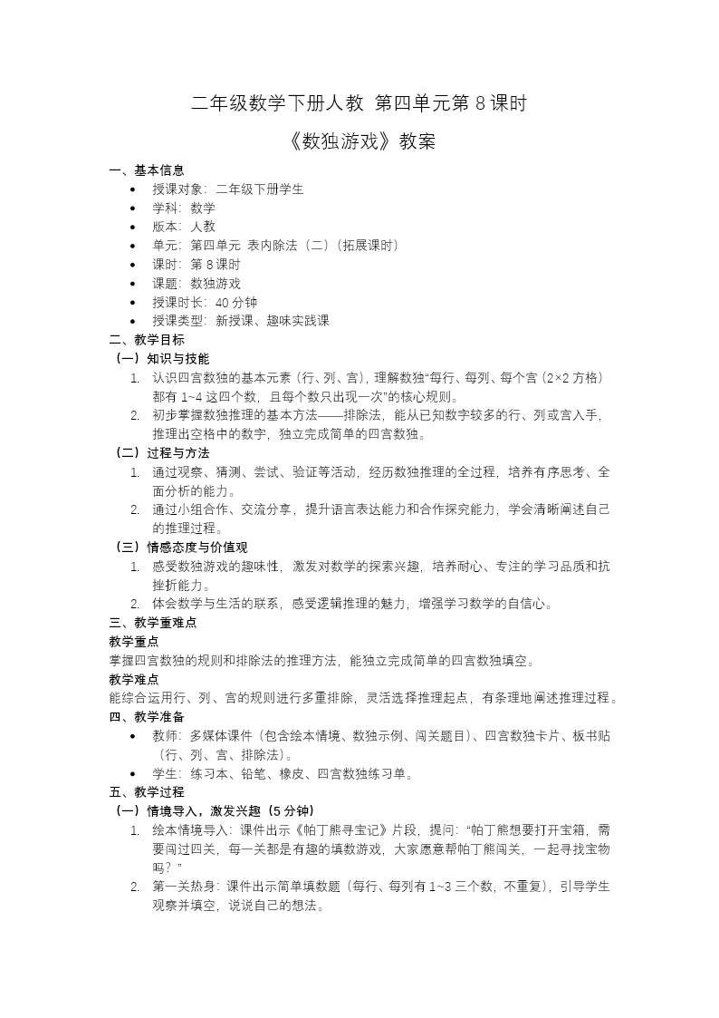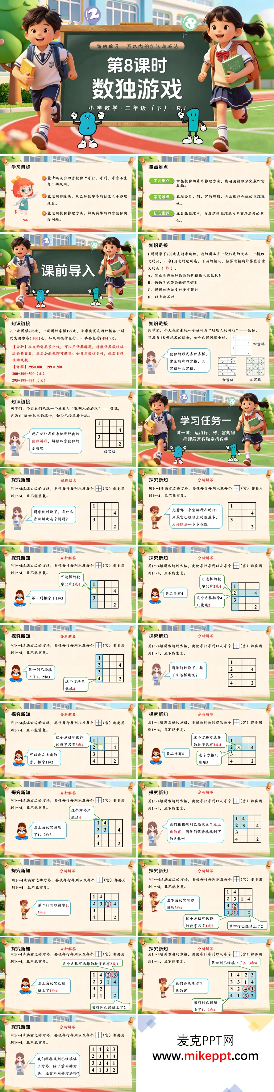 这份PPT是人教二年级下册数学第四单元教学课件,共 39 页,聚焦四宫数独的推理方法。先通过估算旧知练习唤醒已有经验,再介绍数独的起源与常见形式(四宫、六宫、九宫),引出四宫数独挑战。核心学习任务分为两部分:一是探究四宫数独推理,以四宫格例题为载体,讲解"每行、每列、每宫数字 1~4 不重复"的规则,重点演示排除法推理——从已知数字多的位置入手,结合行、列、宫的已有数字,逐步排除不可能选项,确定空格数字,并完整演示解题过程,让学生理解有序推理的逻辑。二是总结推理技巧,提炼数独核心方法:优先选择信息多的空格,用排除法缩小范围,再结合行、列、宫的规则灵活验证,培养有序思考和逻辑推理能力。最后通过课堂练习巩固推理方法,课后布置思维导图与分层作业,让学生在趣味游戏中提升数学思维。