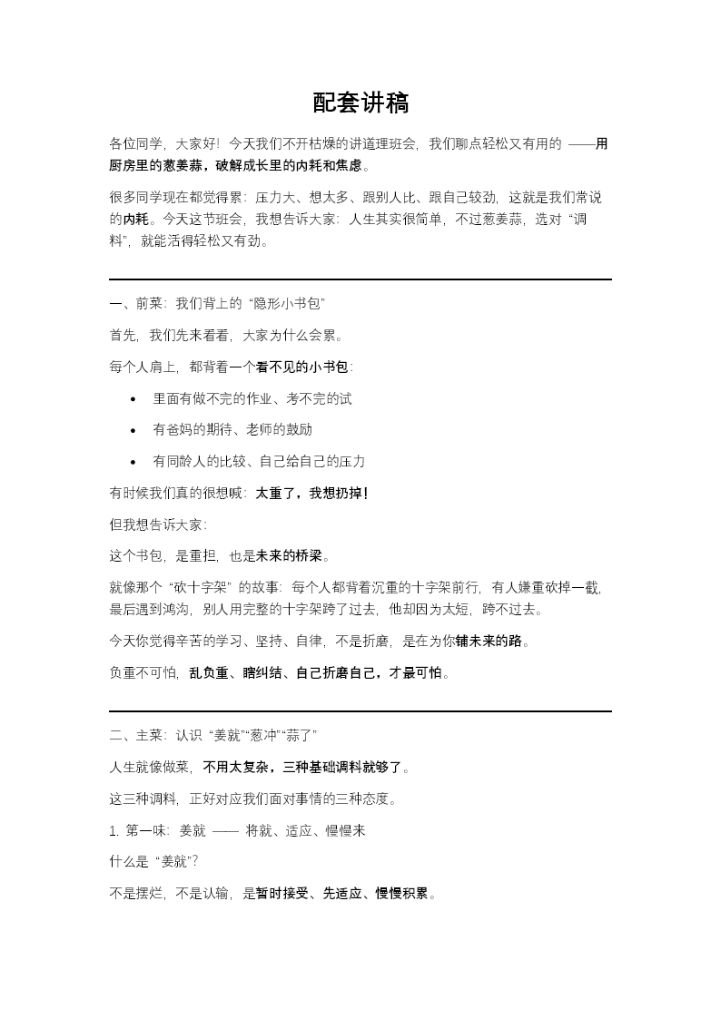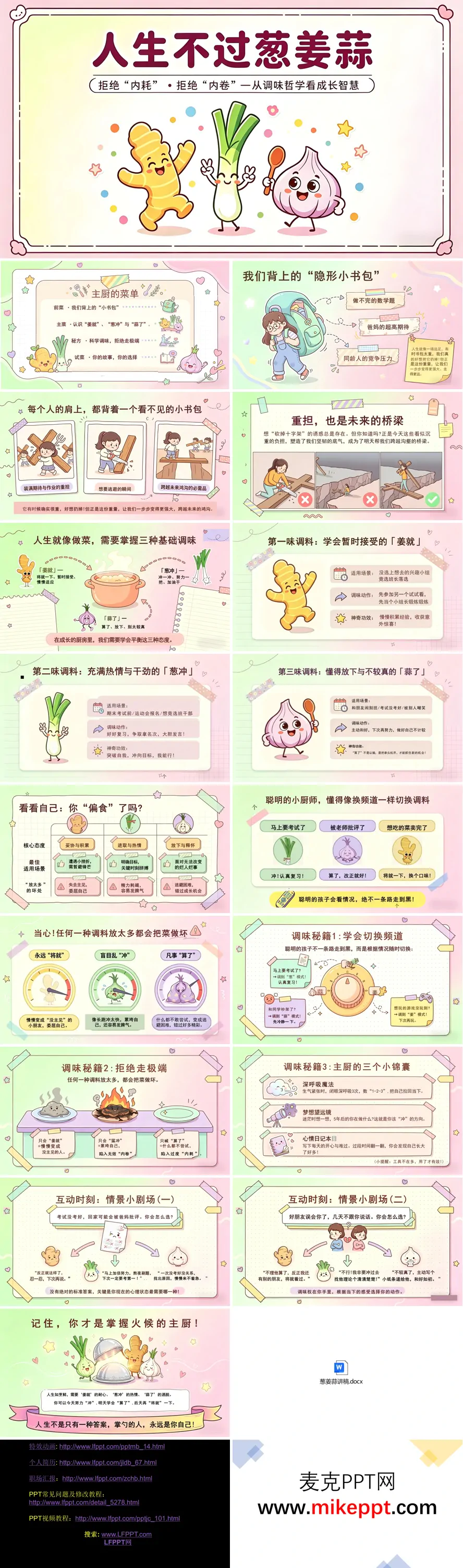 这套心理班会PPT以"拒绝内耗、拒绝内卷"为主题,用可爱的葱姜蒜卡通形象作引,将成长智慧比作烹饪调味,为学生烹制了一堂治愈又启发的生命教育课。课件提炼三种生活态度:像姜一样——暂时接受,在无法改变时学会与现状共处;像葱一样——热情投入,该发力时全力以赴;像蒜一样——放下不较真,适时松手,不为琐事纠缠。三者并非对立,而是教学生在不同场景中灵活切换心态,拒绝走极端。同时搭配情景小剧场、呼吸魔法等互动环节,引导学生认识学习压力与成长负担的常态,理解人生没有唯一的标准答案。最终传递一个核心信念:每个人都是自己人生的主厨,学会根据火候调整配料,才能炒出属于自己的滋味。整体风格轻松有趣、寓教于乐,帮助学生卸下心理重负,在灵活与从容中找回成长的主动权。适合中小学心理健康教育课堂使用。