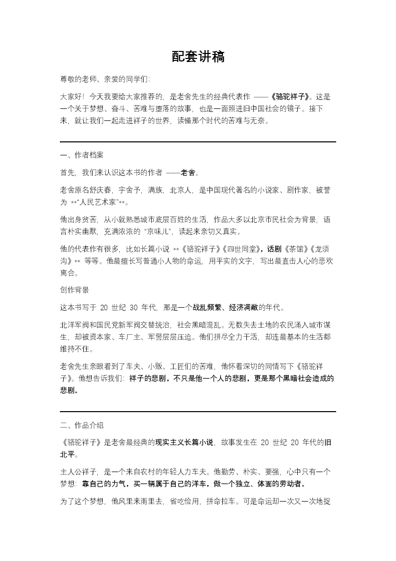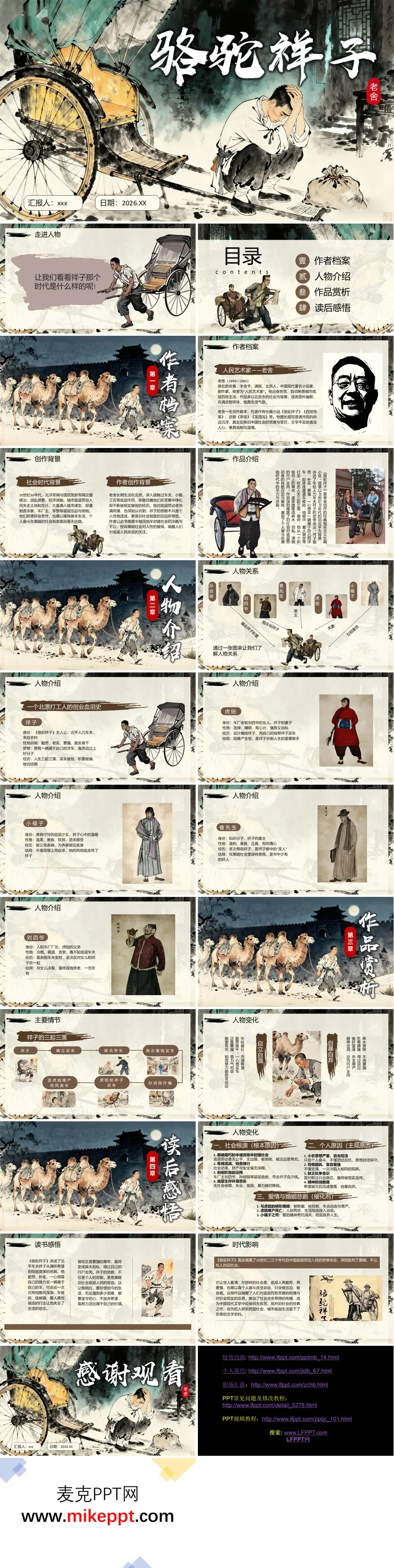 这套PPT围绕老舍的经典小说《骆驼祥子》展开,通过图文并茂的形式,系统性地介绍了作品的多方面内容。整体结构清晰,分为“作者档案”、“人物介绍”、“作品赏析”和“读后感悟”四个主要章节。在视觉呈现上,PPT采用了图文结合的排版方式。图片主要包括:1.人物关系图:以清晰的图示(如中心为祥子,通过连线展示他与虎妞、小福子、曹先生、刘四爷、孙侦探等人物的关系),直观呈现了小说中复杂的人物网络。2.人物介绍图:针对祥子、虎妞、小福子、曹先生、刘四爷等主要角色,均配有形象插图(如祥子拉车、虎妞的泼辣形象、小福子的温婉等)和文字框,简要概括其身份、性格与命运,使人物形象更加生动具体。3.情节脉络图:用图示(如“三起三落”的阶梯式或循环式示意图)直观展示了祥子“买车梦”的几次兴起与破灭过程,以及他从“眼里有光”的青年最终堕落为“行尸走肉”的悲剧轨迹,强调了命运的起伏与最终的沉沦。4.社会背景与原因分析图:在分析祥子悲剧根源的部分,使用了列表或结构图的形式,将原因分为“社会根源”(如黑暗社会、军阀混战、剥削压榨)和“个人原因”(如小农思想、性格固执、缺乏抗争),并辅以相关时代背景图片(如旧北京城面貌、人力车夫群体照片等),图文结合地深化了主题。整体而言,这套PPT的图片内容紧密配合文字论述,起到了形象化人物、可视化情节、结构化分析的作用,有效辅助观众理解《骆驼祥子》的故事脉络、人物命运及其深刻的时代悲剧内涵。