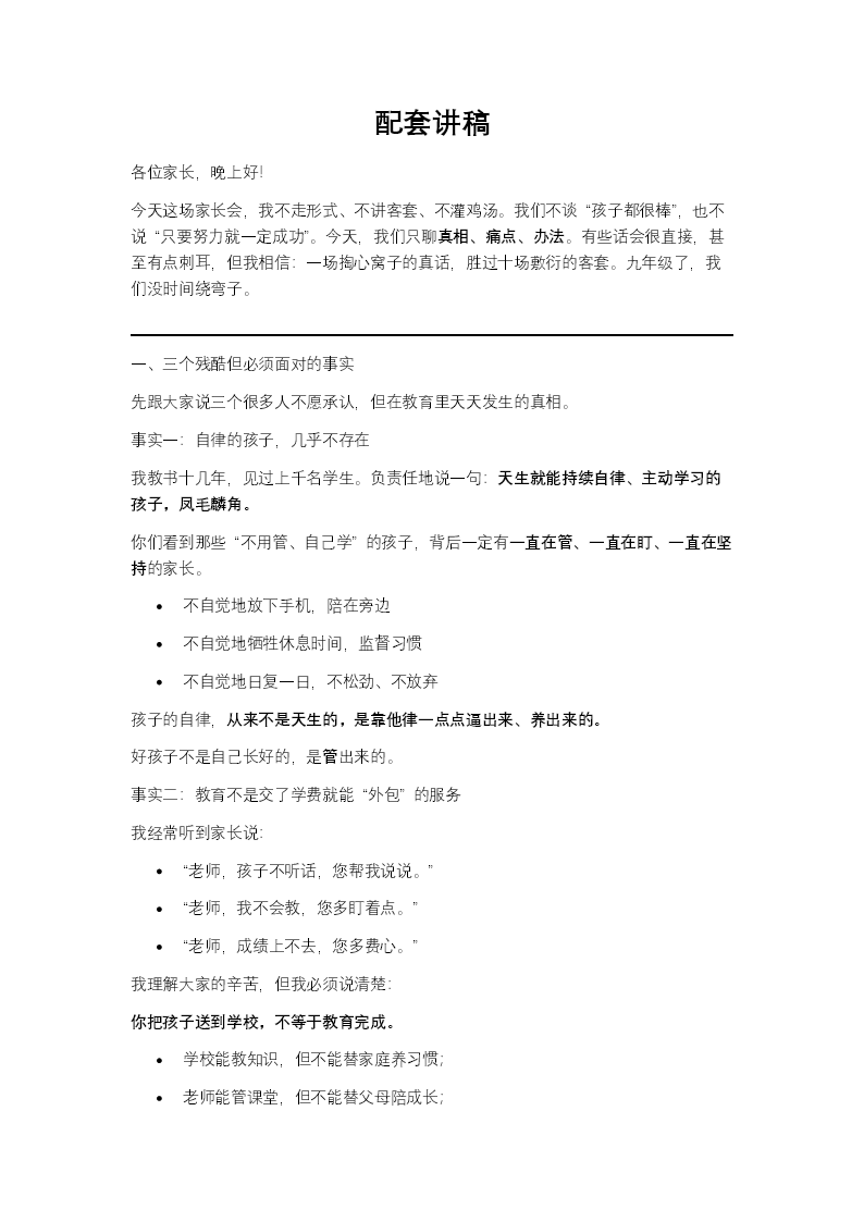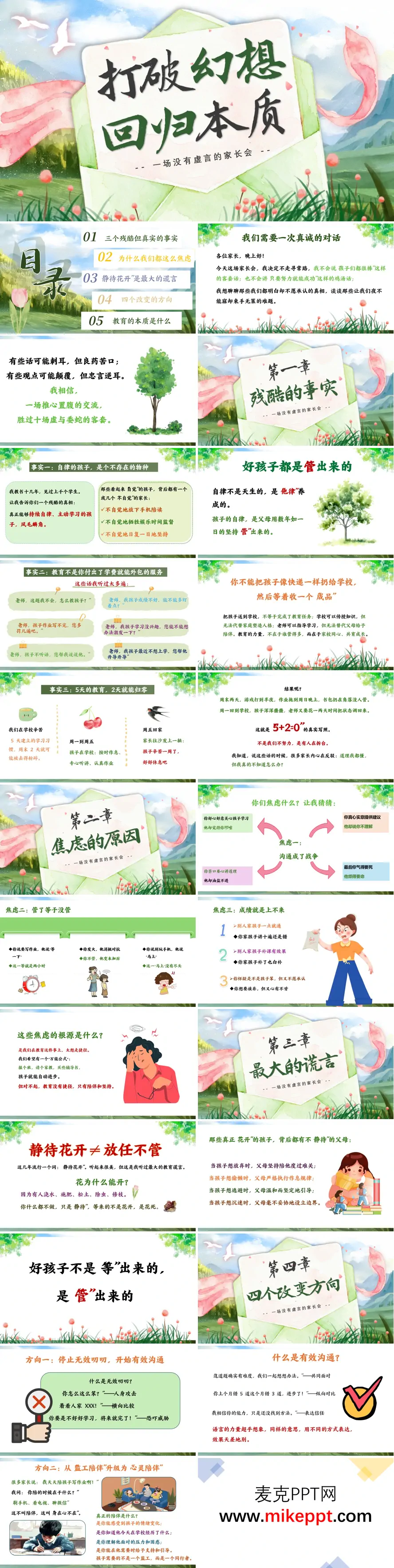 这套家长会PPT以"不说虚言"为基调,直面教育现实,帮助家长走出焦虑迷雾。开篇抛出三个清醒认知:自律并非天生,教育无法外包,家校理念冲突易相互抵消。继而剖析焦虑根源——沟通错位、管教无力、成绩执念如何层层叠加,戳破"静待花开"的被动谎言,让家长看见逃避背后的代价。改变方向清晰务实:停止无效沟通,升级为真正的心灵陪伴;放下唯结果论,转向关注过程本身;建立"三卷三松"的教育观——该卷时卷,该松时松,把握分寸而不走极端。最终回归教育本质:家长的言传身教是最好的教材,家校协同是最稳的支点。内容坦诚直白、不绕弯子,适合教师向家长传递理性教育理念,引导双方在真实与共识中形成合力,陪孩子扎实成长。