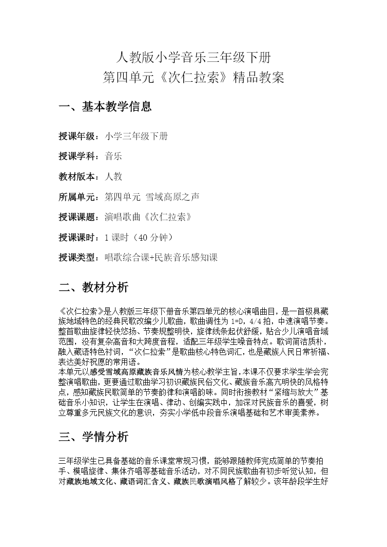 人教小学三年级下册音乐《次仁拉索》教学PPT共26页,以藏地雪山、经幡为视觉元素,充满浓郁民族风情。PPT结构清晰,分四大模块:情境导入环节,通过藏族风光视频引入歌曲,讲解"次仁"(长寿)、"拉索"(衬词)的藏语含义,让学生初步感知藏族民歌氛围;学唱歌曲环节,先进行4/4拍节奏热身,再通过歌词朗读、分句模唱突破附点节奏、连音线等难点,指导学生用快乐明亮的声音演唱,以背唱、小组展示巩固成果;节奏感受与和声实践环节,对比不同段落节奏变化感受情绪差异,尝试为前八小节设计二声部和声并分组合唱,同时创编肢体动作提升音乐表现力;课堂小结与拓展环节,回顾歌曲文化内涵与演唱技巧,布置课后任务,鼓励学生向家人分享歌曲,继续探索藏族音乐魅力。整套PPT围绕审美感知、艺术表现、文化理解与创意实践四大核心素养,让学生在学唱、和声与律动中感受藏族音乐的热情与美好。