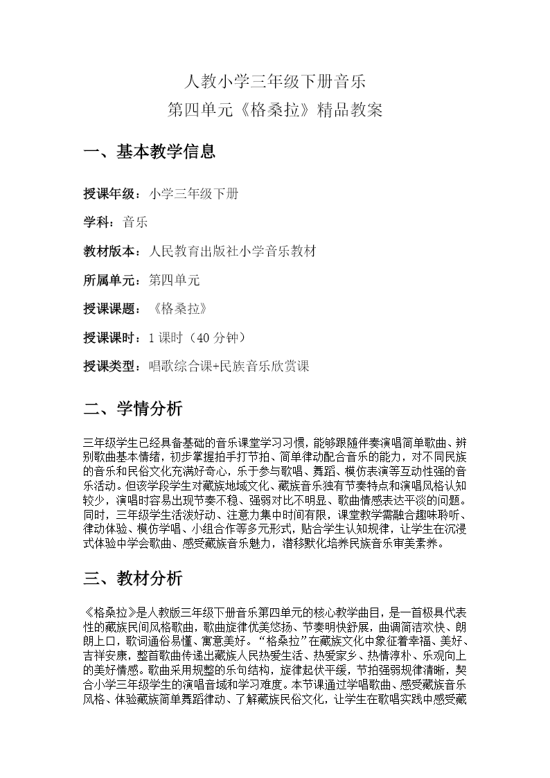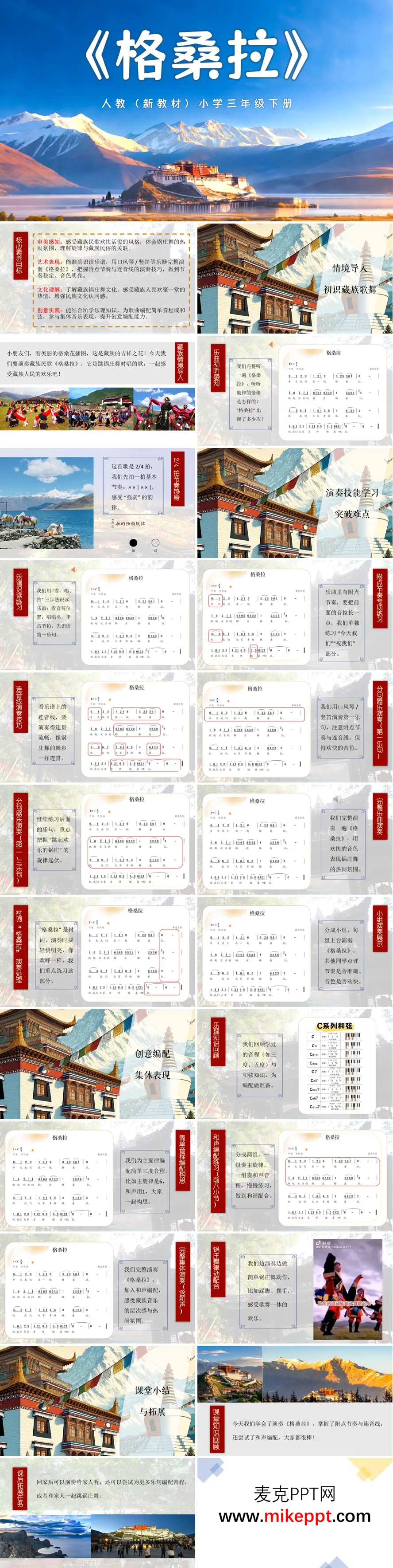 人教小学三年级下册音乐《格桑拉》器乐教学PPT共26页,以布达拉宫、雪山等藏地风光为背景,洋溢浓郁民族氛围。PPT分四大模块:情境导入以格桑花和锅庄舞视频引入,介绍歌曲为藏族锅庄舞伴唱曲,让学生感受民族歌舞的欢乐氛围,初听感知旋律与"格桑拉"衬词;演奏技能学习先进行2/4拍节奏热身,通过"看、唱、拍"三步识读乐谱,重点突破附点节奏与连音线难点,分句练习口风琴或竖笛演奏,指导学生以欢快音色表现锅庄舞的热闹;创意编配与集体表现回顾乐理知识,为旋律编配简单和声与和弦并分组练习,结合锅庄舞跺脚、摆手等动作实现边演奏边律动,感受歌舞一体之趣;课堂小结与拓展回顾演奏技巧与文化知识,布置课后任务,鼓励学生向家人展示演奏、尝试更多编配,传承藏族音乐文化。整套PPT围绕审美感知、艺术表现、文化理解与创意实践,让学生在器乐演奏与律动中感受藏族歌舞的热情魅力。