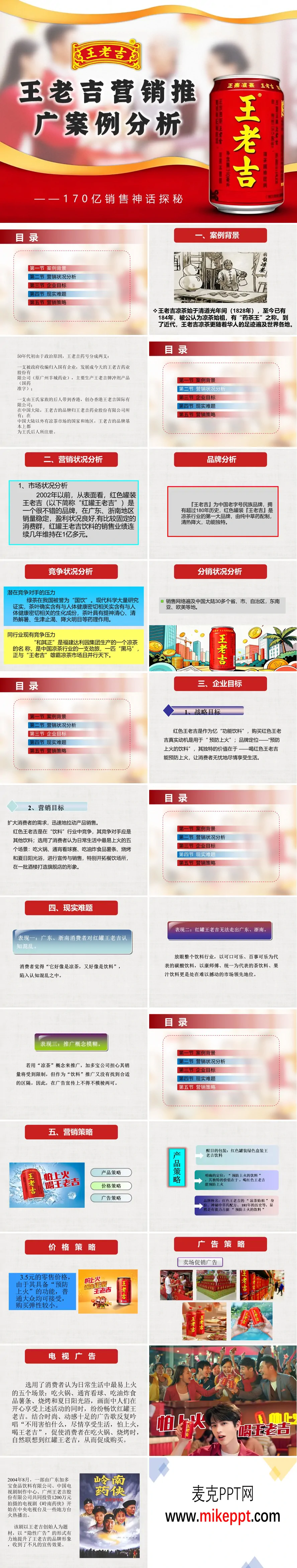 这套PPT内容主要围绕王老吉凉茶的品牌发展、市场定位与营销策略展开。从结构上看,PPT分为五节:案例背景、营销状况分析、企业目标、现实难题和营销策略。具体而言,PPT首先介绍了王老吉作为拥有超过180年历史的凉茶始祖的背景,以及品牌因历史原因在大陆和海外由不同主体持有的情况。接着,它深入分析了2002年之前的市场状况,指出红色罐装王老吉虽然有一定区域市场,但存在消费者认知混乱(不清楚它是“凉茶”还是“饮料”)、难以突破广东和浙南市场、以及推广概念模糊等核心难题。面对这些挑战,PPT阐述了企业的战略目标是将产品明确定位为“预防上火的饮料”,并从功能属性转向日常饮料消费场景。营销策略部分是其重点,详细展示了包括醒目的红罐包装、“怕上火,喝王老吉”的广告语、针对吃火锅、烧烤等五个易上火场景的电视广告、电视剧《岭南药侠》的隐性广告投放、餐饮渠道的终端物料推广,以及从2002年到2007年持续增长的巨额广告投放费用。最后,PPT附上了历年销量增长图表,直观展示了其营销策略带来的业绩飞跃,销量从2002年的约1.8亿元迅猛增长至2009年的约170亿元。总而言之,这份PPT系统地复盘了王老吉通过精准的“预防上火”定位,结合大规模、场景化的广告宣传和地面推广,成功从一个区域性产品转型为全国性饮料领导品牌的营销案例。