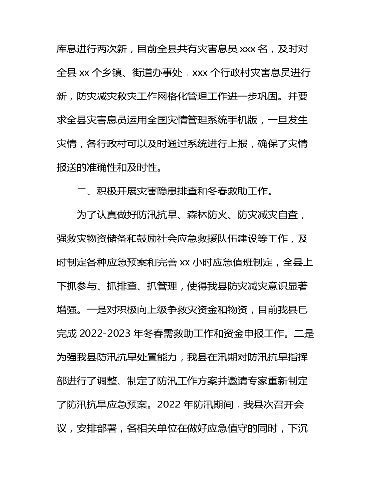 二、积极开展灾害隐患排查和冬春救助工作。为了认真做好防汛抗旱、森林防火、防灾减灾自查,强救灾物资储备和鼓励社会应急救援队伍建设等工作,及时制定各种应急预案和完善xx小时应急值班制定,全县上下抓参与、抓排查、抓管理,使得我县防灾减灾意识显著增强。一是对积极向上级争救灾资金和物资,目前我县已完成2022-2023年冬春需救助工作和资金申报工作。二是为强我县防汛抗旱处置能力,我县在汛期对防汛抗旱指挥部进行了调整、制定了防汛工作方案并邀请专家重新制定了防汛抗旱应急预案。2022年防汛期间,我县次召开会议,安排部署,各相关单位在做好应急值守的同时,下沉到一线,确保早发现、早预防、早处理,今年我县防汛期间安全稳定,未发生人员伤亡性灾害事故。三是落实防汛值班安排和息联络机制,进一步完善了应急预案和值班制度,严明工作纪律、岗位责任,明确岗位目标,处理业务有条不紊。四是强报灾工作管理。2022年我县共遭受x次自然灾害,其中风雹灾害x次,旱灾x次,损失较为严重的为x月份旱灾。三次自然灾害造成我县xx个乡镇、街道办事处不同程度受灾,共造成我县受灾人口xxxxx人,受灾面积xxxxx亩,共造成经济损失xxx万元,其中农业经济损失xxx万元。