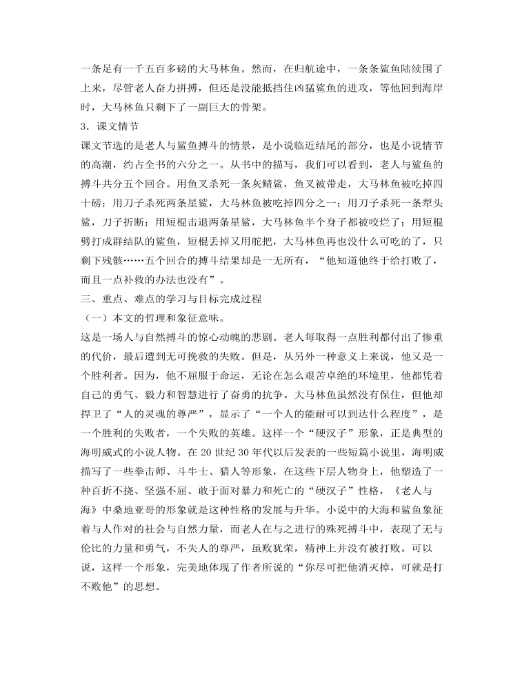 1.【提问】老人为什么说:“可是一个人并不是生来要给打败的”,“你尽可把他消灭掉,可就是打不败他”?【明确】这句话是桑地亚哥的内心独白,也是小说的核心精神,它生动地揭示了桑地亚哥的内心世界和人生追求,也是作者海明威的思想观与价值观的反映。这句话意味着,人生的使命是奋斗,是与命运做不懈的抗争。人生下来虽然面临种种自然与社会的挑战,也许这些挑战强大到足以把人的肉体消灭,但一个人只要保持旺盛的斗志和在任何艰难险阻面前不屈服的精神,人就永远是胜利者。小说中的老渔夫桑地亚哥虽然最终没能保住大马林鱼,但在与鲨鱼搏斗的过程中,他表现出无与伦比的力量和勇气,不失人的尊严,是精神上的胜利者。2.【提问】文中的独白有什么特点?在文中起什么作用?