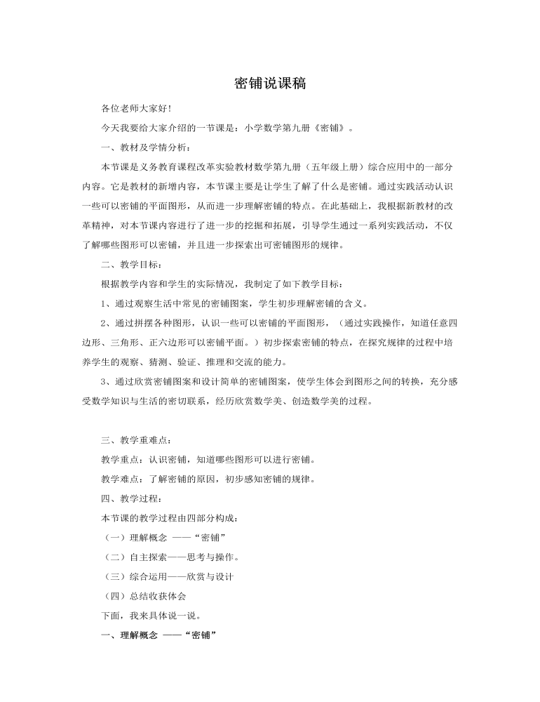 本节课是义务教育课程改革实验教材数学第九册(五年级上册)综合应用中的一部分内容。它是教材的新增内容,本节课主要是让学生了解了什么是密铺。通过实践活动认识一些可以密铺的平面图形,从而进一步理解密铺的特点。在此基础上,我根据新教材的改革精神,对本节课内容进行了进一步的挖掘和拓展,引导学生通过一系列实践活动,不仅了解哪些图形可以密铺,并且进一步探索出可密铺图形的规律。二、教学目标:根据教学内容和学生的实际情况,我制定了如下教学目标:1、通过观察生活中常见的密铺图案,学生初步理解密铺的含义。2、通过拼摆各种图形,认识一些可以密铺的平面图形,(通过实践操作,知道任意四边形、三角形、正六边形可以密铺平面。)初步探索密铺的特点,在探究规律的过程中培养学生的观察、猜测、验证、推理和交流的能力。