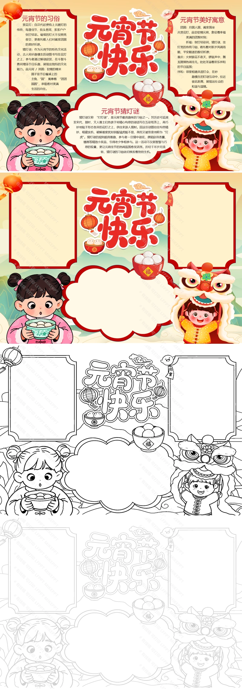 这款"元宵节快乐"主题手抄报弥漫着温馨喜庆的节日氛围,整体以柔和明媚的暖黄色调为视觉主线,巧妙融入憨态可掬的萌娃品尝汤圆、威风凛凛的醒狮贺岁、流光溢彩的红灯笼等传统元素,既承载着醇厚浓郁的年俗韵味,又洋溢着天真烂漫的童趣魅力。为满足课堂示范、临摹创作、手工涂色等多元应用场景,模板精心设计四种功能版本:色泽饱满的成品展示版、结构明晰的彩色留白版、激发艺术想象的黑白线稿版,以及便于精准描摹的淡雅线稿版,全面兼顾范例引领与个性表达的双重需求。内容架构深度聚焦元宵节核心民俗传统,精心设置三大文化板块。"元宵节的习俗"系统梳理赏花灯的视觉盛宴、猜灯谜的智力雅趣等经典活动的历史脉络与演变轨迹;"元宵节美好寓意"深入解读月圆人团圆的情感寄托、祈福纳祥的文化象征,传递中华民族对美满生活的恒久向往;"元宵节猜灯谜"则生动讲述这一融知识性趣味性于一体的民俗活动如何从宫廷雅乐走向民间狂欢的独特魅力。各功能区运用矩形规整、云朵灵动等异形边框进行创意区隔,既营造出层次分明的视觉节奏,又赋予版面活泼灵动的艺术气质。成品版以详实的民俗知识与优美的文案范例供学生参考研习,空白版更预留充裕的创作空间,鼓励孩子书写亲身经历的元宵趣事与节日感悟,堪称一份融文化传承、审美培育与动手实践于一体的优质元宵节主题手抄报模板。